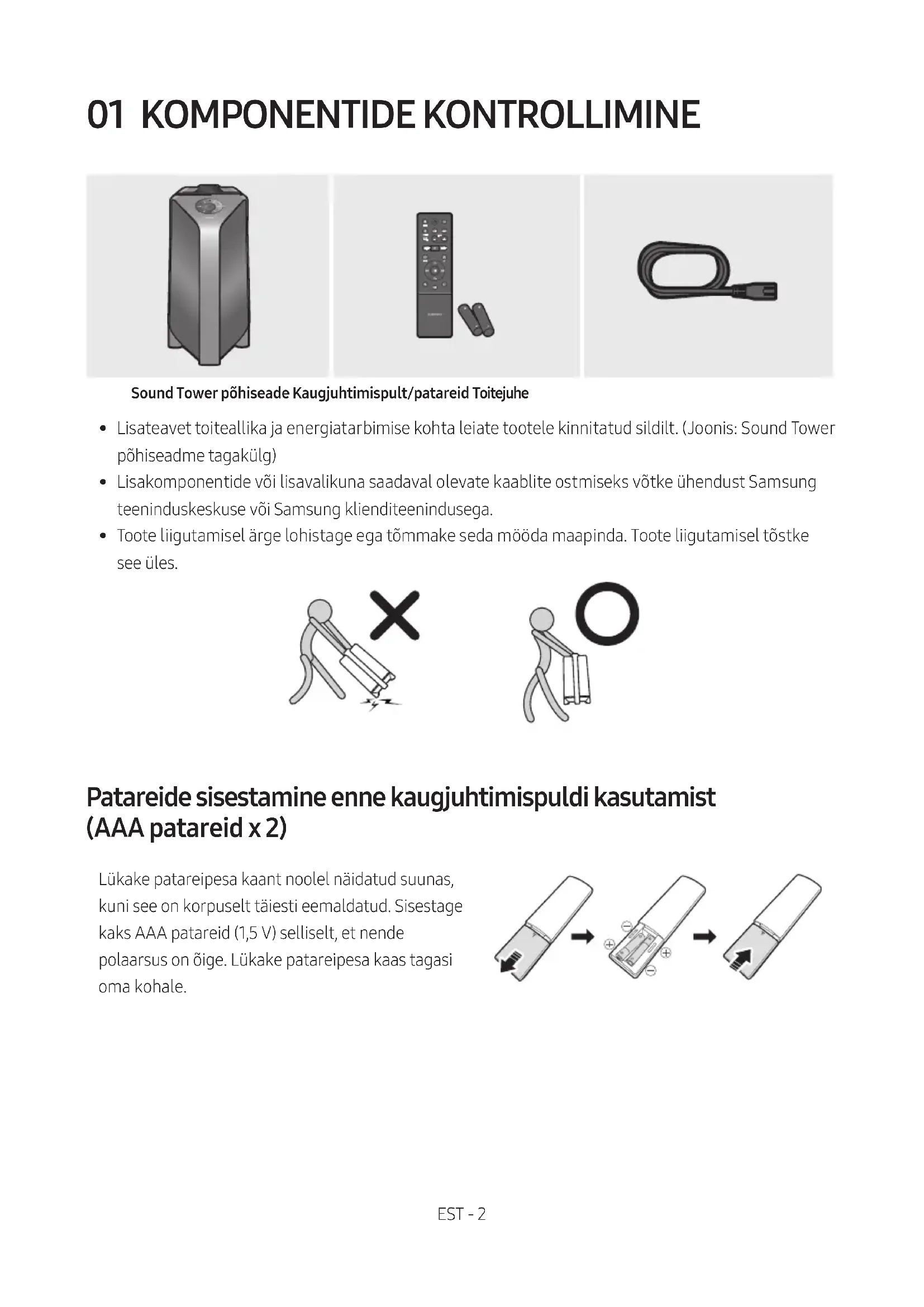 TÄIELIKUST KASUTUSJUHENDIST pääsete juurde Samsungi veebipõhises klienditoekeskuses, skannides QR-koodi. Juhendi vaatamiseks arvutis või mobiilsideseadmes laadige see dokumendi vormingus Samsungi veebisaidilt alla. (http://www.samsung.com/support) Disain ja tehnilised andmed võivad muutuda ilma ette teatamata. Giga Party Audio uus nimi on Sound Tower.EST - iv SISUKORD 01 Komponentide kontrollimine 2 Patareide sisestamine enne kaugjuhtimispuldi kasutamist (AAA patareid x 2) ------------------------- 2 02 Toote ülevaade 3 Sound Tower ülemine paneel ------------------------- 3 Sound Tower tagumine paneel ------------------------- 4 03 Sound Tower ühendamine 6 Elektritoite ühendamine
