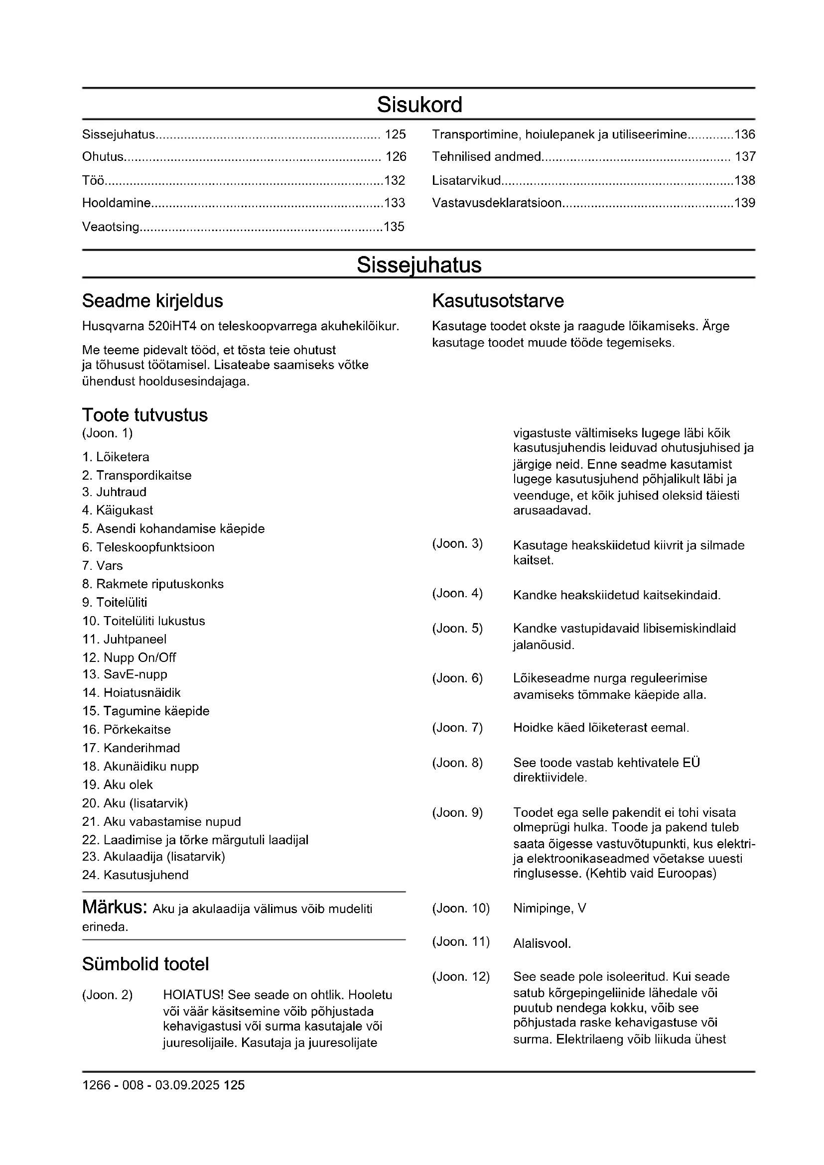 Märkus: Aku ja akulaadija välimus võib mudeliti erineda. Sümbolid tootel (Joon. 2) HOIATUS! See seade on ohtlik. Hooletu või väär käsitsemine võib põhjustada kehavigastusi või surma kasutajale või juuresolijaile. Kasutaja ja juuresolijate vigastuste vältimiseks lugege läbi kõik kasutusjuhendis leiduvad ohutusjuhised ja järgige neid. Enne seadme kasutamist lugege kasutusjuhend põhjalikult läbi ja veenduge, et kõik juhised oleksid täiesti arusaadavad. (Joon. 3) Kasutage heakskiidetud kiivrit ja silmade kaitset. (Joon. 4) Kandke heakskiidetud kaitsekindaid. (Joon. 5) Kandke vastupidavaid libisemiskindlaid jalanõusid. (Joon. 6) Lõikeseadme nurga reguleerimise avamiseks tõmmake käepide alla. (Joon. 7) Hoidke käed lõiketerast eemal. (Joon. 8) See toode vastab kehtivatele EÜ direktiividele. (Joon. 9) Toodet ega selle pakendit ei tohi visata olmeprügi hulka. Toode ja pakend tuleb saata õigesse vastuvõtupunkti, kus elektri- ja elektroonikaseadmed võetakse uuesti ringlusesse. (Kehtib vaid Euroopas) (Joon. 10) Nimipinge, V (Joon. 11) Alalisvool. (Joon. 12) See seade pole isoleeritud. Kui seade satub kõrgepingeliinide lähedale või puutub nendega kokku, võib see põhjustada raske kehavigastuse või surma. Elektrilaeng võib liikuda ühest 1266 - 008 - 03.09.2025 125punktist teise kaarlahenduse teel. Mida kõrgem on pinge, seda suurema vahemaa võib elektrilaeng „hüpata“. Elektrit võivad juhtida ka oksad ja muud esemed, eriti siis, kui nad on märjad. Hoidke seade kõrgepingeliinidest ja kõigist neid puudutavatest esemetest alati vähemalt 10 meetri kaugusel. Kui peate töötama ohutsoonis, tuleb alati võtta ühendust vastava elektrifirmaga, et elekter enne töö alustamist välja lülitataks. Töö ajal hoiduge inimestest ja loomadest vähemalt 15 meetri kaugusele. (Joon. 13) Kaitske veepritsmete eest. aaaannxxxx Mudeli etikett näitab seerianumbrit. aaaa on tootmisaasta, nn on tootmis- nädal ja xxxx on järjekorranumber. Märkus: Ülejäänud seadmel toodud sümbolid/ tähised viitavad erinevates riikides kehtivatele sertifitseerimisnõuetele. Akul ja/või akulaadijal olevad sümbolid. (Joon. 17) Toimetage seade elektri- ja elektroonikajäätmete ringlusse- võtukeskusesse. (Kehtib vaid Euroopas) (Joon. 14) Tõrkekindel trafo. (Joon. 15) Kasutage ja hoiustage akulaadijat ainult siseruumides. (Joon. 16) Topeltisolatsioon. Toote kahjustused Me ei vastuta meie tootele tekitatud kahjude eest, kui: