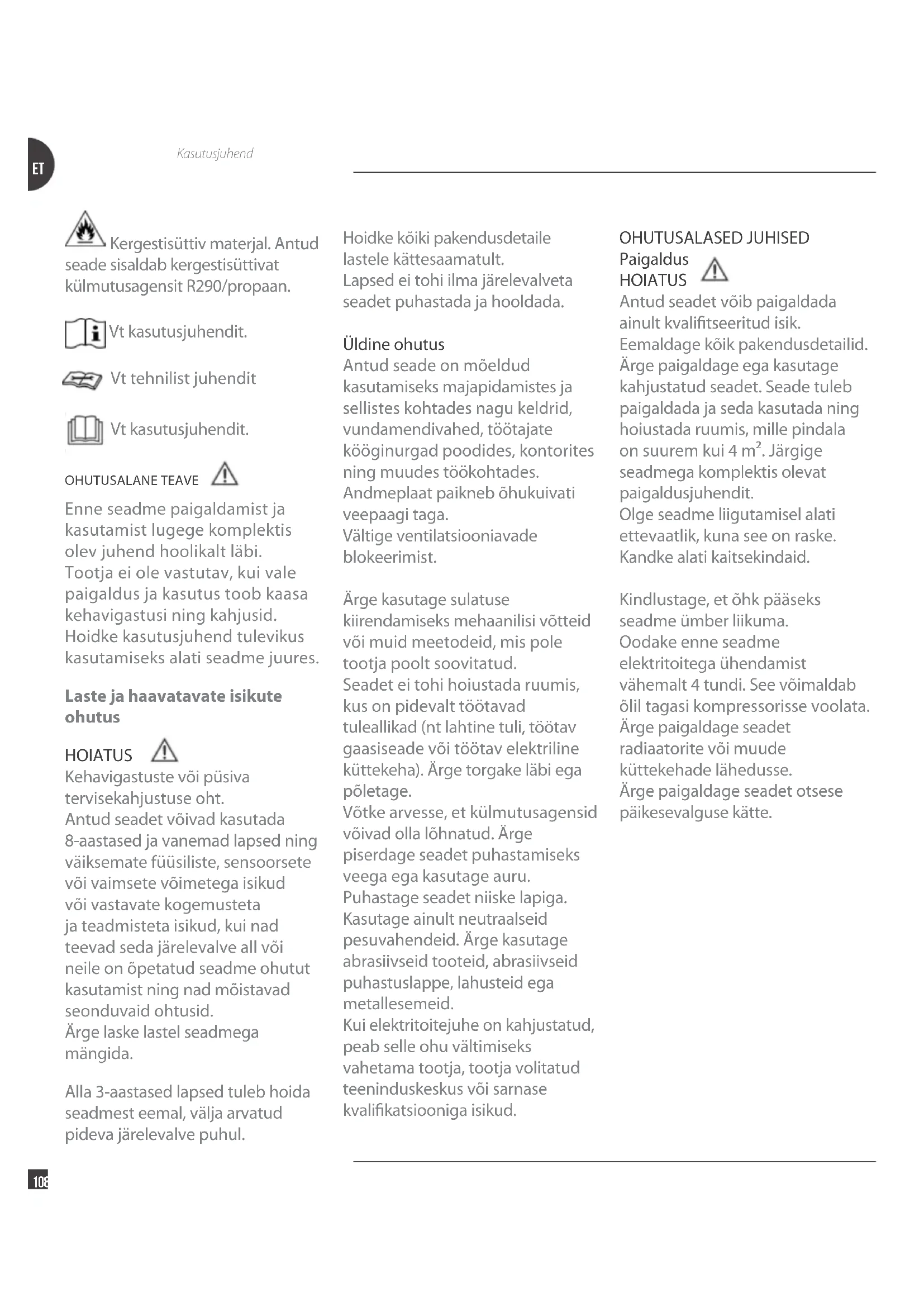 Kasutusjuhend Kergestisüttiv materjal. Antud seade sisaldab kergestisüttivat külmutusagensit R290/propaan. Vt kasutusjuhendit. Vt tehnilist juhendit Vt kasutusjuhendit. OHUTUSALANE TEAVE Enne seadme paigaldamist ja kasutamist lugege komplektis olev juhend hoolikalt läbi. Tootja ei ole vastutav, kui vale paigaldus ja kasutus toob kaasa kehavigastusi ning kahjusid. Hoidke kasutusjuhend tulevikus kasutamiseks alati seadme juures. Laste ja haavatavate isikute ohutus HOIATUS Kehavigastuste või püsiva tervisekahjustuse oht. Antud seadet võivad kasutada 8-aastased ja vanemad lapsed ning väiksemate füüsiliste, sensoorsete või vaimsete võimetega isikud või vastavate kogemusteta ja teadmisteta isikud, kui nad teevad seda järelevalve all või neile on õpetatud seadme ohutut kasutamist ning nad mõistavad seonduvaid ohtusid. Ärge laske lastel seadmega mängida. Alla 3-aastased lapsed tuleb hoida seadmest eemal, välja arvatud pideva järelevalve puhul.