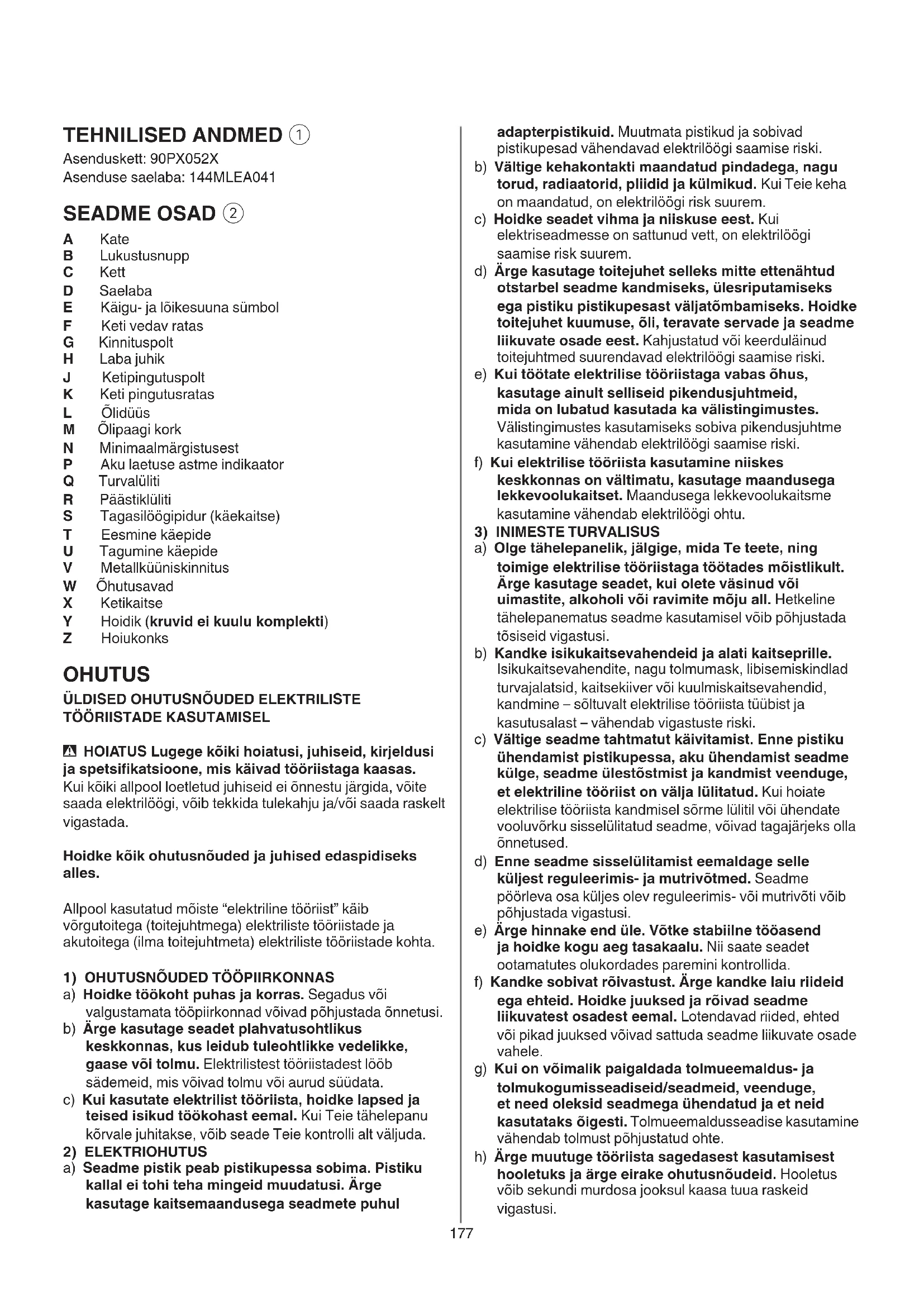 - HOIATUS Lugege kõiki hoiatusi, juhiseid, kirjeldusi ja spetsikatsioone, mis käivad tööriistaga kaasas. Kui kõiki allpool loetletud juhiseid ei õnnestu järgida, võite saada elektrilöögi, võib tekkida tulekahju ja/või saada raskelt vigastada. Hoidke kõik ohutusnõuded ja juhised edaspidiseks alles. Allpool kasutatud mõiste “elektriline tööriist” käib võrgutoitega (toitejuhtmega) elektriliste tööriistade ja akutoitega (ilma toitejuhtmeta) elektriliste tööriistade kohta.