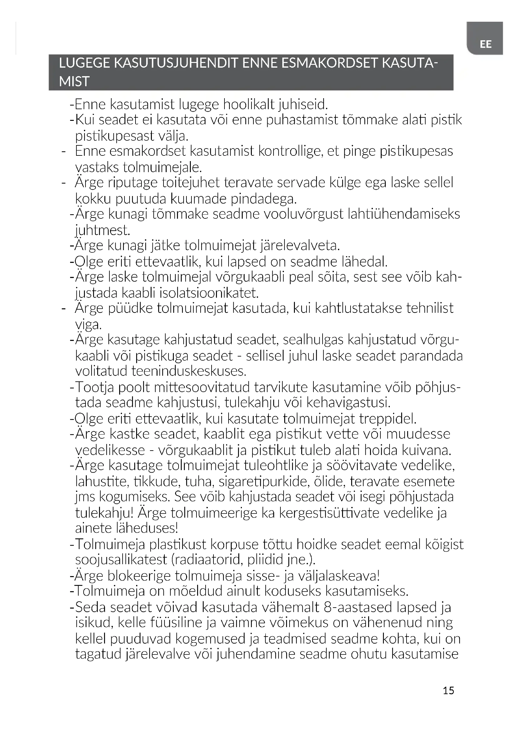 Kasutage tolmuimejat ainult siseruumides ja ainult kuivade pindade tolmuimeerimiseks. Märgpuhastatud vaibad kuivatatakse enne tolmuimeerimist. - Laste ohutuse tagamiseks ärge jätke vabalt ligipääsetavaid pa