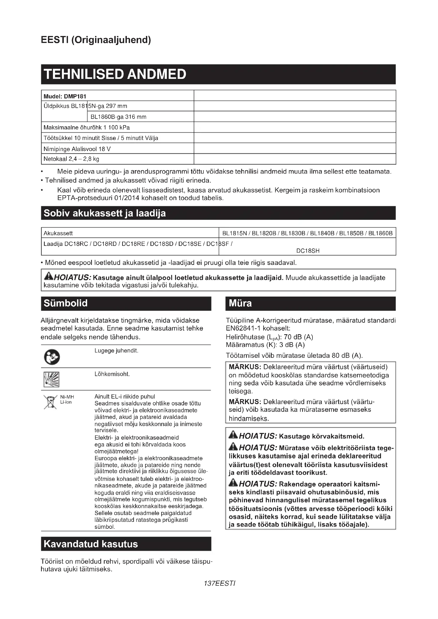 - Mõned eespool loetletud akukassetid ja -laadijad ei pruugi olla teie riigis saadaval. HOIATUS: Kasutage ainult ülalpool loetletud akukassette ja laadijaid. Muude akukassettide ja laadijate kasutamine võib tekitada vigastusi ja/või tulekahju. Sümbolid Alljärgnevalt kirjeldatakse tingmärke, mida võidakse seadmetel kasutada. Enne seadme kasutamist tehke endale selgeks nende tähendus. Lugege juhendit. Lõhkemisoht. Ni-MH Li-ion Ainult EL-i riikide puhul Seadmes sisalduvate ohtlike osade tõttu võivad elektri- ja elektroonikaseadmete jäätmed, akud ja patareid avaldada negatiivset mõju keskkonnale ja inimeste tervisele. Elektri- ja elektroonikaseadmeid ega akusid ei tohi kõrvaldada koos olmejäätmetega! Euroopa elektri- ja elektroonikaseadmete jäätmete, akude ja patareide ning nende jäätmete direktiivi ja riiklikku õigusesse üle- võtmise kohaselt tuleb elektri- ja elektroo- nikaseadmete, akude ja patareide jäätmed koguda eraldi ning viia eraldiseisvasse olmejäätmete kogumispunkti, mis tegutseb kooskõlas keskkonnakaitse eeskirjadega. Sellele osutab seadmele paigaldatud läbikriipsutatud ratastega prügikasti sümbol. Kavandatud kasutus Tööriist on mõeldud rehvi, spordipalli või väikese täispu- hutava ujuki täitmiseks. Müra Tüüpiline A-korrigeeritud müratase, määratud standardi EN62841-1 kohaselt: Helirõhutase (L