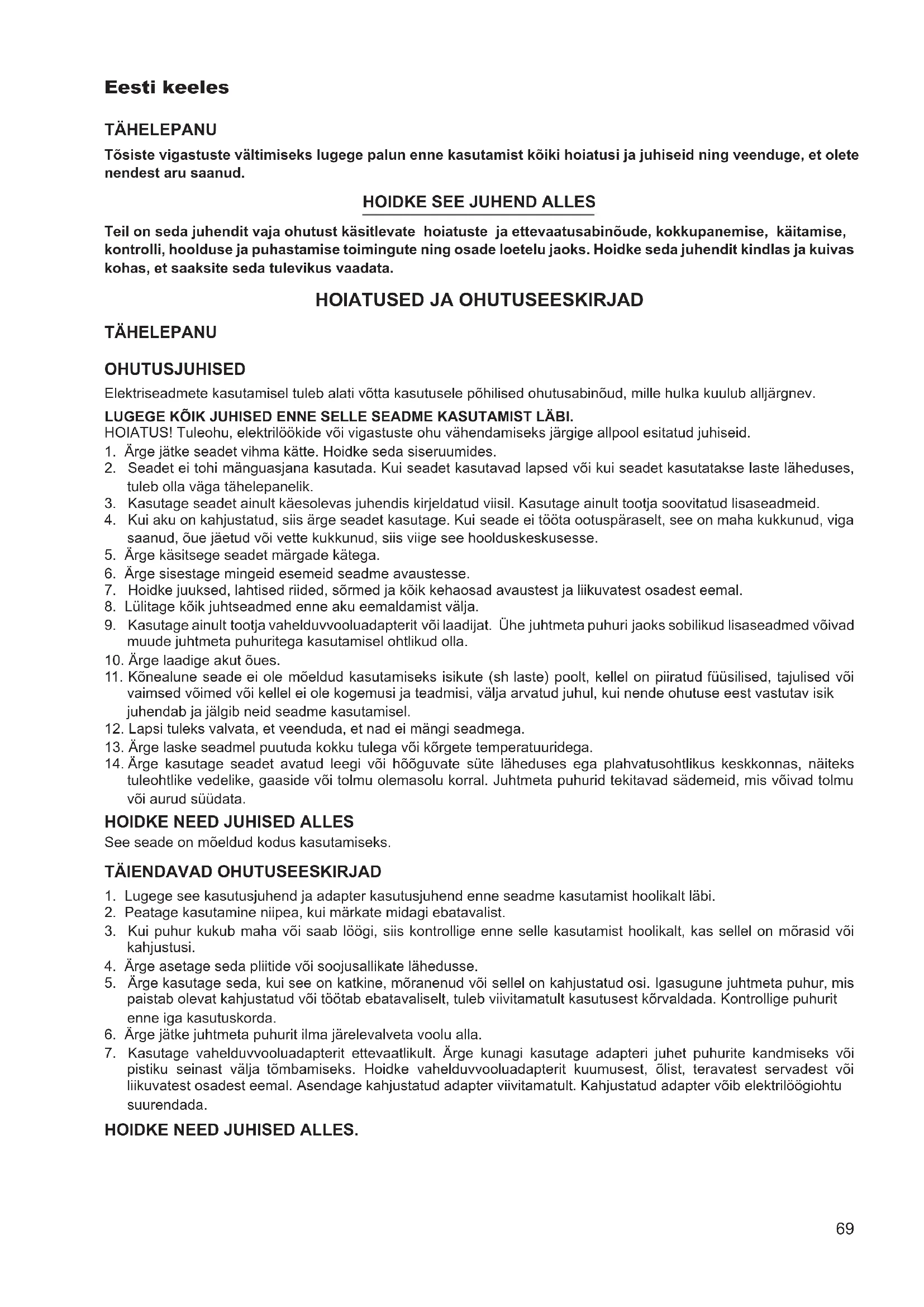 TÄHELEPANU OHUTUSJUHISED Elektriseadmete kasutamisel tuleb alati võtta kasutusele põhilised ohutusabinõud, mille hulka kuulub alljärgnev. LUGEGE KÕIK JUHISED ENNE SELLE SEADME KASUTAMIST LÄBI. HOIATUS! Tuleohu, elektrilöökide või vigastuste ohu vähendamiseks järgige allpool esitatud juhiseid.