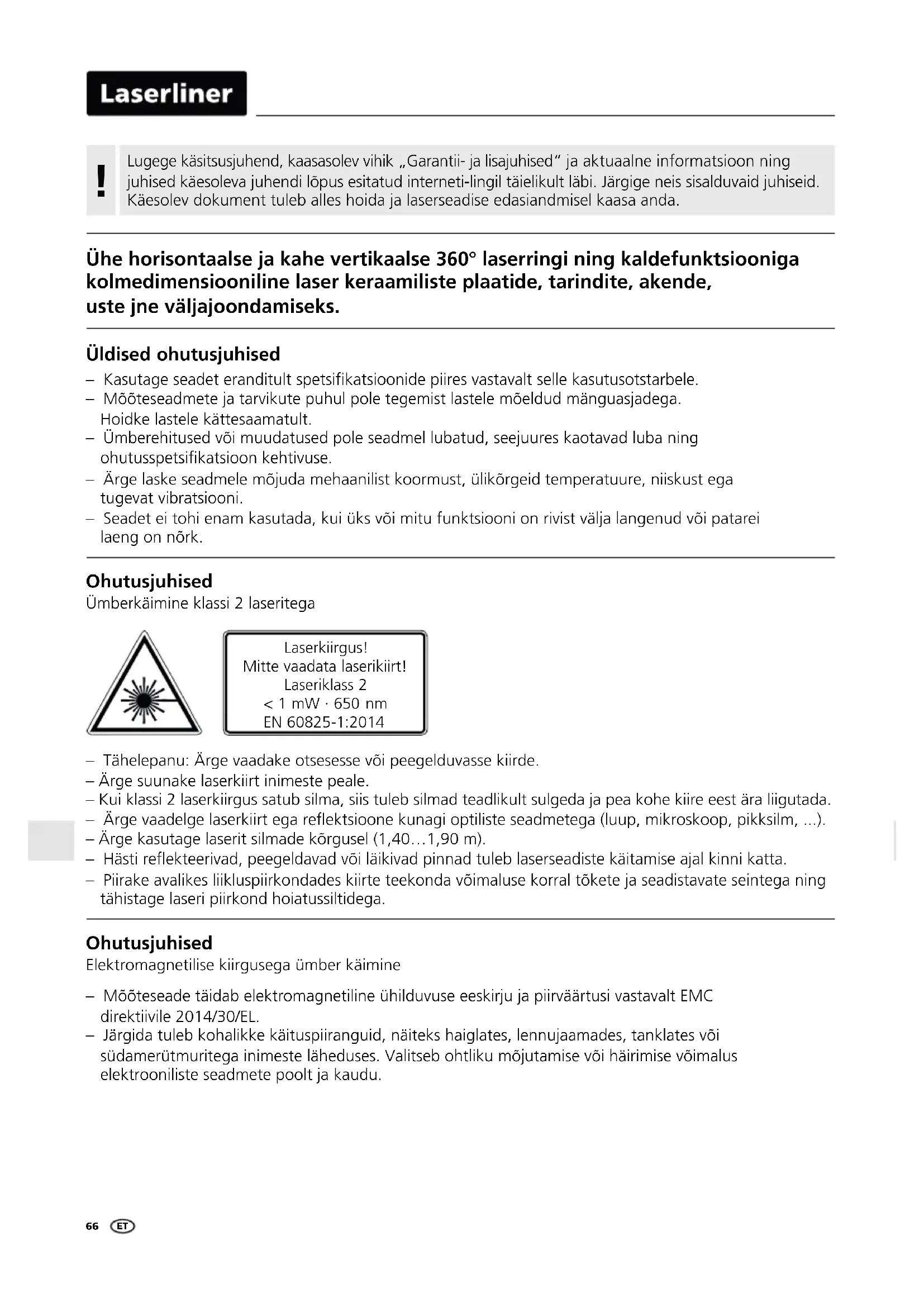 – Ärge laske seadmele mõjuda mehaanilist koormust, ülikõrgeid temperatuure, niiskust ega tugevat vibratsiooni. – Seadet ei tohi enam kasutada, kui üks või mitu funktsiooni on rivist välja langenud või patarei laeng on nõrk. Ühe horisontaalse ja kahe vertikaalse 360° laserringi ning kaldefunktsiooniga kolmedimensiooniline laser keraamiliste plaatide, tarindite, akende, uste jne väljajoondamiseks. Lugege käsitsusjuhend, kaasasolev vihik „Garantii- ja lisajuhised“ ja aktuaalne informatsioon ning juhised käesoleva juhendi lõpus esitatud interneti-lingil täielikult läbi. Järgige neis sisalduvaid juhiseid. Käesolev dokument tuleb alles hoida ja laserseadise edasiandmisel kaasa anda.