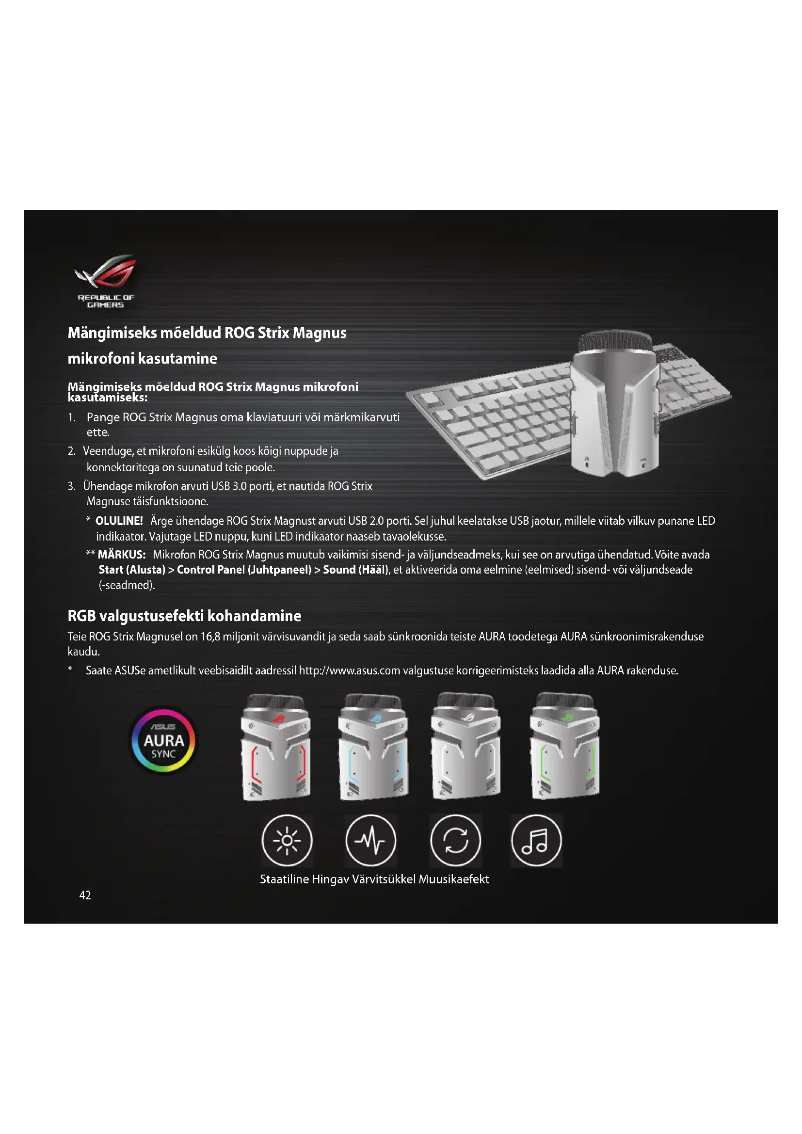 - OLULINE! Ärge ühendage ROG Strix Magnust arvuti USB 2.0 porti. Sel juhul keelatakse USB jaotur, millele viitab vilkuv punane LED indikaator. Vajutage LED nuppu, kuni LED indikaator naaseb tavaolekusse. ** MÄRKUS: Mikrofon ROG Strix Magnus muutub vaikimisi sisend- ja väljundseadmeks, kui see on arvutiga ühendatud. Võite avada Start (Alusta) > Control Panel (Juhtpaneel) > Sound (Hääl), et aktiveerida oma eelmine (eelmised) sisend- või väljundseade (-seadmed). RGB valgustusefekti kohandamine Teie ROG Strix Magnusel on 16,8 miljonit värvisuvandit ja seda saab sünkroonida teiste AURA toodetega AURA sünkroonimisrakenduse kaudu.