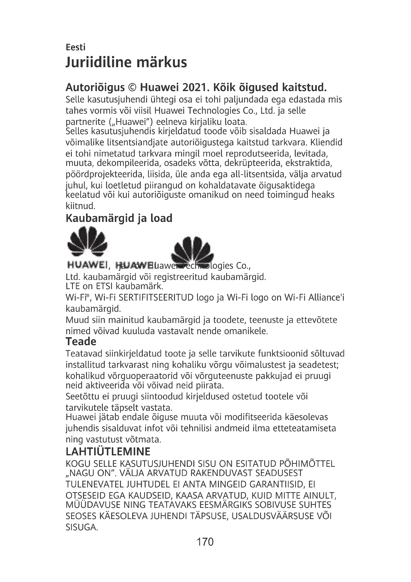 , Wi-Fi SERTIFITSEERITUD logo ja Wi-Fi logo on Wi-Fi Alliance'i kaubamärgid. Muud siin mainitud kaubamärgid ja toodete, teenuste ja ettevõtete nimed võivad kuuluda vastavalt nende omanikele. Teade Teatavad siinkirjeldatud toote ja selle tarvikute funktsioonid sõltuvad installitud tarkvarast ning kohaliku võrgu võimalustest ja seadetest; kohalikud võrguoperaatorid või võrguteenuste pakkujad ei pruugi neid aktiveerida või võivad neid piirata. Seetõttu ei pruugi siintoodud kirjeldused ostetud tootele või tarvikutele täpselt vastata. Huawei jätab endale õiguse muuta või moditseerida käesolevas juhendis sisalduvat infot või tehnilisi andmeid ilma etteteatamiseta ning vastutust võtmata. LAHTIÜTLEMINE KOGU SELLE KASUTUSJUHENDI SISU ON ESITATUD PÕHIMÕTTEL „NAGU ON”. VÄLJA ARVATUD RAKENDUVAST SEADUSEST TULENEVATEL JUHTUDEL EI ANTA MINGEID GARANTIISID, EI OTSESEID EGA KAUDSEID, KAASA ARVATUD, KUID MITTE AINULT, MÜÜDAVUSE NING TEATAVAKS EESMÄRGIKS SOBIVUSE SUHTES SEOSES KÄESOLEVA JUHENDI TÄPSUSE, USALDUSVÄÄRSUSE VÕI SISUGA.