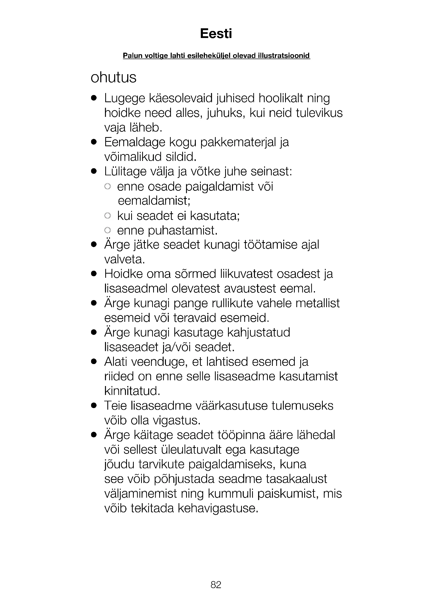 Lülitage välja ja võtke juhe seinast: enne osade paigaldamist või eemaldamist; kui seadet ei kasutata; enne puhastamist.