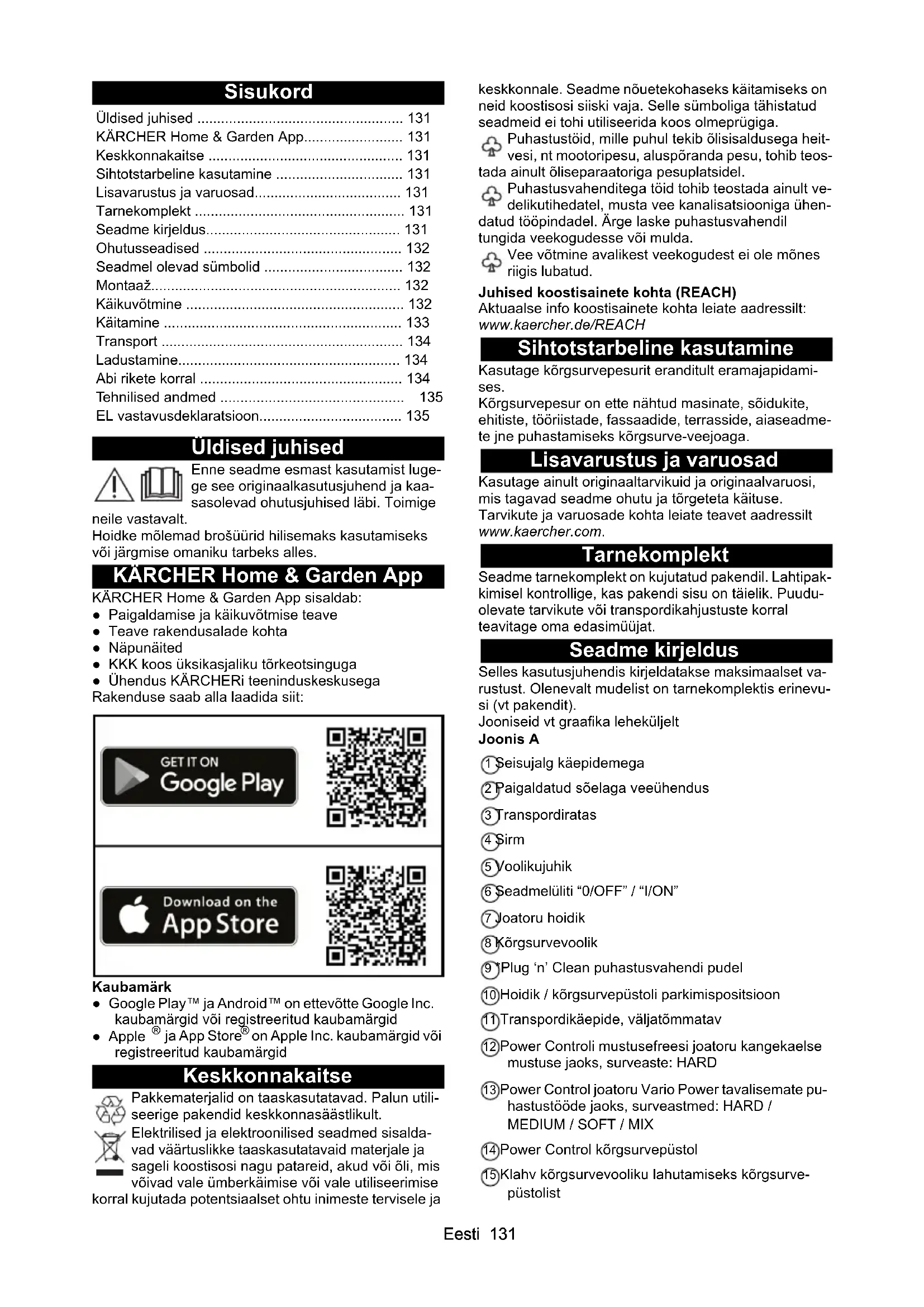 dB(A) 92 Chairman of the Board of Management Director Regulatory Affairs & Certification H. Jenner S. ReiserEesti 131 Sisukord Üldised juhised Enne seadme esmast kasutamist luge- ge see originaalkasutusjuhend ja kaa- sasolevad ohutusjuhised läbi. Toimige neile vastavalt. Hoidke mõlemad brošüürid hilisemaks kasutamiseks või järgmise omaniku tarbeks alles. KÄRCHER Home & Garden App KÄRCHER Home & Garden App sisaldab: ● Paigaldamise ja käikuvõtmise teave ● Teave rakendusalade kohta ● Näpunäited ● KKK koos üksikasjaliku tõrkeotsinguga ● Ühendus KÄRCHERi teeninduskeskusega Rakenduse saab alla laadida siit: Kaubamärk ● Google Play™ ja Android™ on ettevõtte Google Inc. kaubamärgid või registreeritud kaubamärgid ● Apple