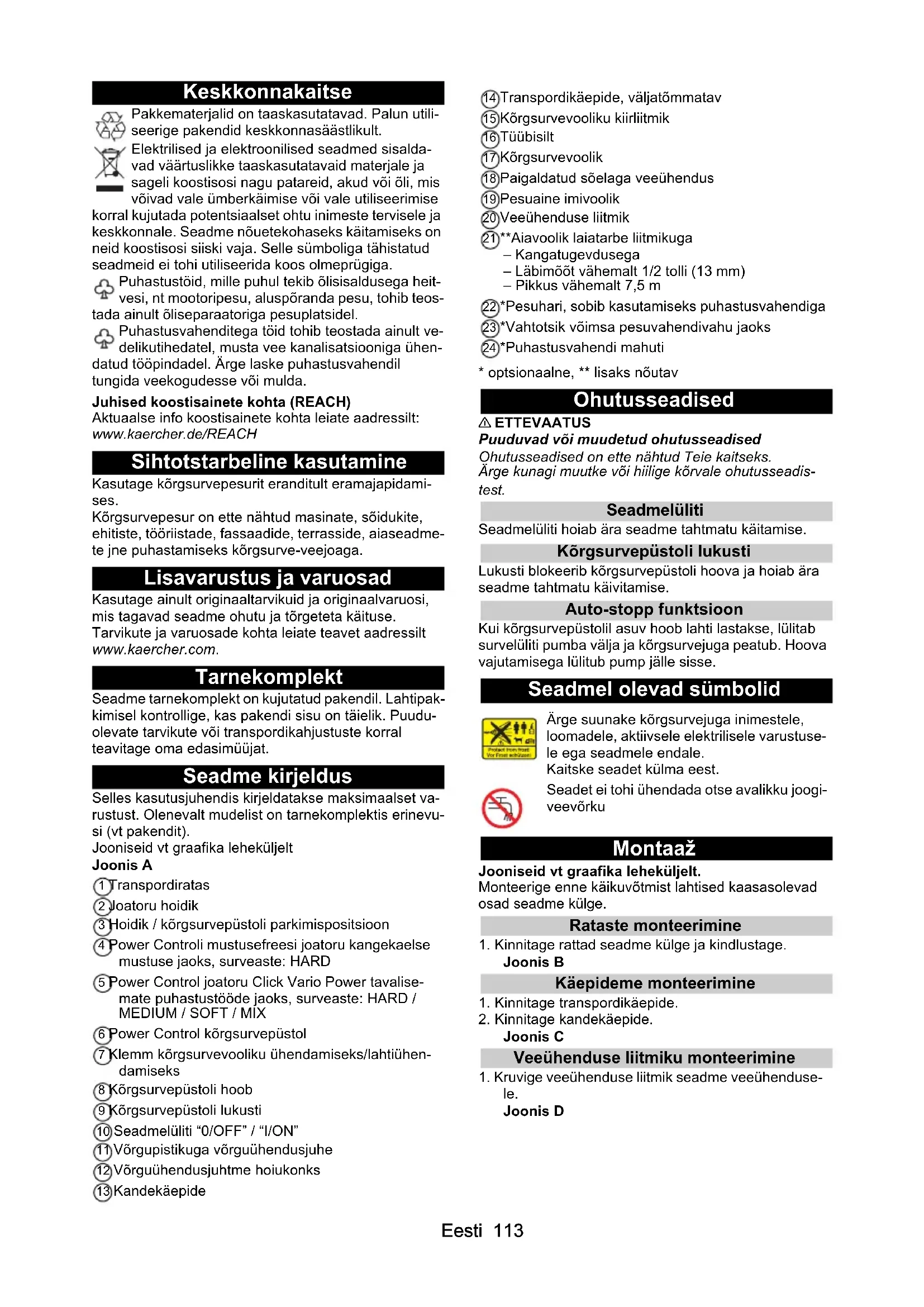 • EL vastavusdeklaratsioon Eesti 113 Keskkonnakaitse Pakkematerjalid on taaskasutatavad. Palun utili- seerige pakendid keskkonnasäästlikult. Elektrilised ja elektroonilised seadmed sisalda- vad väärtuslikke taaskasutatavaid materjale ja sageli koostisosi nagu patareid, akud või õli, mis võivad vale ümberkäimise või vale utiliseerimise korral kujutada potentsiaalset ohtu inimeste tervisele ja keskkonnale. Seadme nõuetekohaseks käitamiseks on neid koostisosi siiski vaja. Selle sümboliga tähistatud seadmeid ei tohi utiliseerida koos olmeprügiga. Puhastustöid, mille puhul tekib õlisisaldusega heit- vesi, nt mootoripesu, aluspõranda pesu, tohib teos- tada ainult õliseparaatoriga pesuplatsidel. Puhastusvahenditega töid tohib teostada ainult ve- delikutihedatel, musta vee kanalisatsiooniga ühen- datud tööpindadel. Ärge laske puhastusvahendil tungida veekogudesse või mulda. Juhised koostisainete kohta (REACH) Aktuaalse info koostisainete kohta leiate aadressilt: www.kaercher.de/REACH Sihtotstarbeline kasutamine Kasutage kõrgsurvepesurit eranditult eramajapidami- ses. Kõrgsurvepesur on ette nähtud masinate, sõidukite, ehitiste, tööriistade, fassaadide, terrasside, aiaseadme- te jne puhastamiseks kõrgsurve-veejoaga. Lisavarustus ja varuosad Kasutage ainult originaaltarvikuid ja originaalvaruosi, mis tagavad seadme ohutu ja tõrgeteta käituse. Tarvikute ja varuosade kohta leiate teavet aadressilt www.kaercher.com. Tarnekomplekt Seadme tarnekomplekt on kujutatud pakendil. Lahtipak- kimisel kontrollige, kas pakendi sisu on täielik. Puudu- olevate tarvikute või transpordikahjustuste korral teavitage oma edasimüüjat. Seadme kirjeldus Selles kasutusjuhendis kirjeldatakse maksimaalset va- rustust. Olenevalt mudelist on tarnekomplektis erinevu- si (vt pakendit). Jooniseid vt graafika leheküljelt Joonis A 1 Transpordiratas 2 Joatoru hoidik 3 Hoidik / kõrgsurvepüstoli parkimispositsioon 4 Power Controli mustusefreesi joatoru kangekaelse mustuse jaoks, surveaste: HARD 5 Power Control joatoru Click Vario Power tavalise- mate puhastustööde jaoks, surveaste: HARD / p. 116