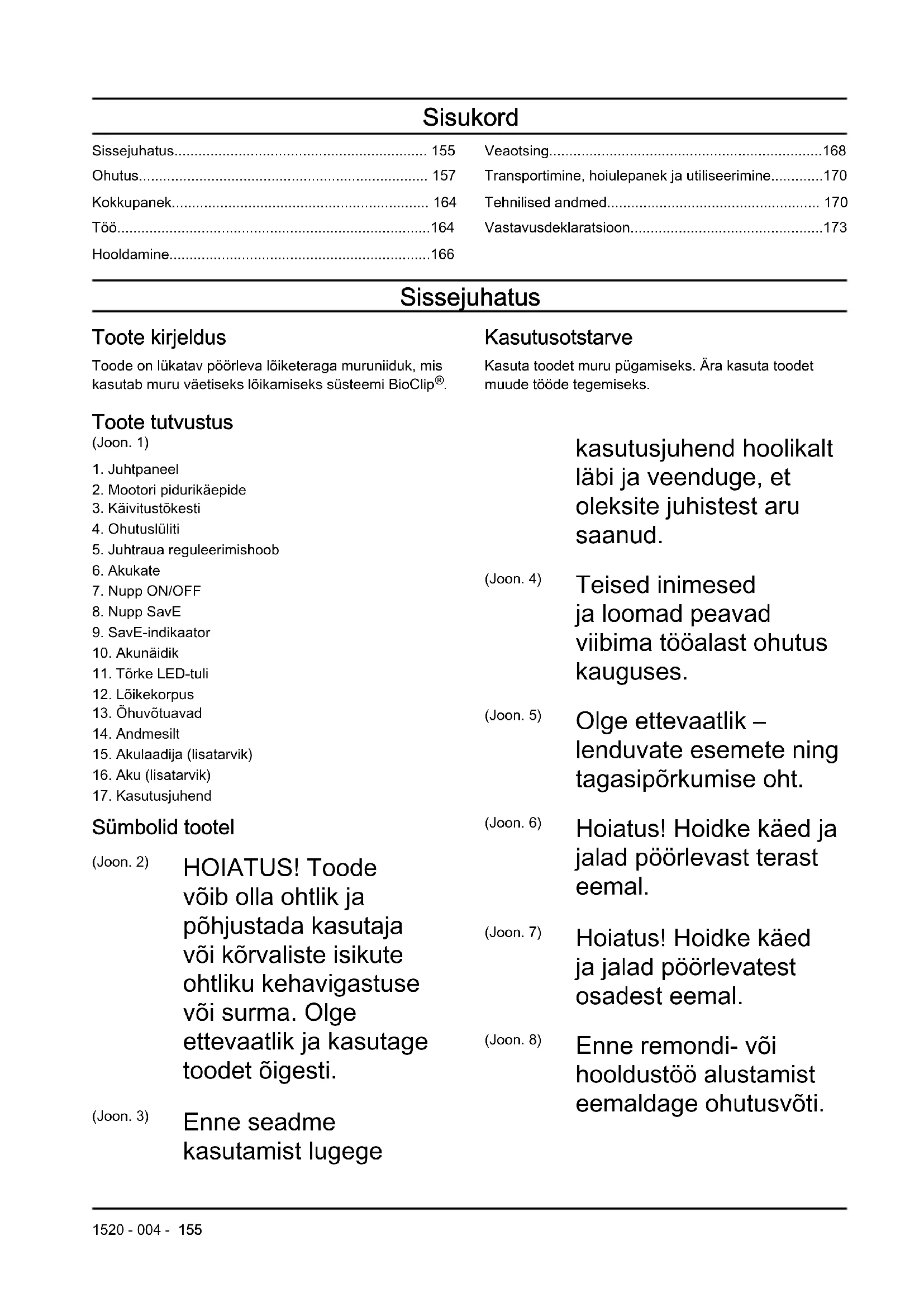 Sümbolid tootel (Joon. 2) HOIATUS! Toode võib olla ohtlik ja põhjustada kasutaja või kõrvaliste isikute ohtliku kehavigastuse või surma. Olge ettevaatlik ja kasutage toodet õigesti. (Joon. 3) Enne seadme kasutamist lugege kasutusjuhend hoolikalt läbi ja veenduge, et oleksite juhistest aru saanud. (Joon. 4) Teised inimesed ja loomad peavad viibima tööalast ohutus kauguses. (Joon. 5) Olge ettevaatlik – lenduvate esemete ning tagasipõrkumise oht. (Joon. 6) Hoiatus! Hoidke käed ja jalad pöörlevast terast eemal. (Joon. 7) Hoiatus! Hoidke käed ja jalad pöörlevatest osadest eemal. (Joon. 8) Enne remondi- või hooldustöö alustamist eemaldage ohutusvõti. 1520 - 004 - 155(Joon. 9) Keskkonnamärgis.Tood e või toote pakend ei kuulu olmejäätmete hulka. Toimetage see elektri- ja elektroonikajäätmete heakskiidetud vastuvõtupunkti. (Joon. 10) See seade vastab kehtivatele EÜ direktiividele. (Joon. 11) See toode vastab kehtivatele UK direktiividele. (Joon. 12) See seade vastab kehtivatele Euraasia Tolliliidu direktiividele. (Joon. 13) See seade vastab kehtivatele UkrSEPRO direktiividele. (Joon. 14) See seade vastab kehtivatele RCMi direktiividele. Kehtib ainult Austraalias ja Uus-Meremaal (Joon. 15) Müraemissioonile viitav keskkonnasilt vastavalt ELi ja UK direktiividele ja määrustele ja Uus Lõuna- Walesi õigusaktile „Protection of the Environment Operations (Noise Control) Regulation 2017“. Toote garanteeritud helivõimsuse taseme andmed leiate jaotisest Tehnilised andmed lk