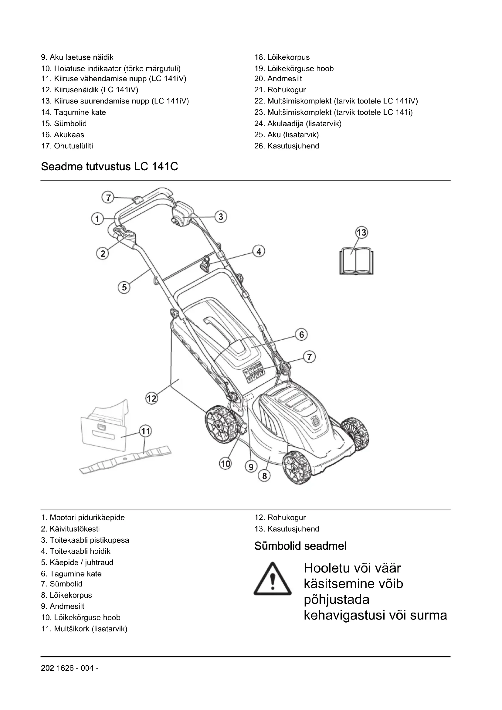 1626 - 004 -vibratsioon, peatage toode viivitamatult. Seisake mootor, keerake ohutuslüliti asendisse 0 ja eemaldage aku (mudel LC 141iV ja LC 141i) või lahutage toitekaabel (mudel LC 141C). Kontrollige toodet kahjustuste suhtes. Parandage kahjustused või laske toodet remontida volitatud hooldustöökojas.