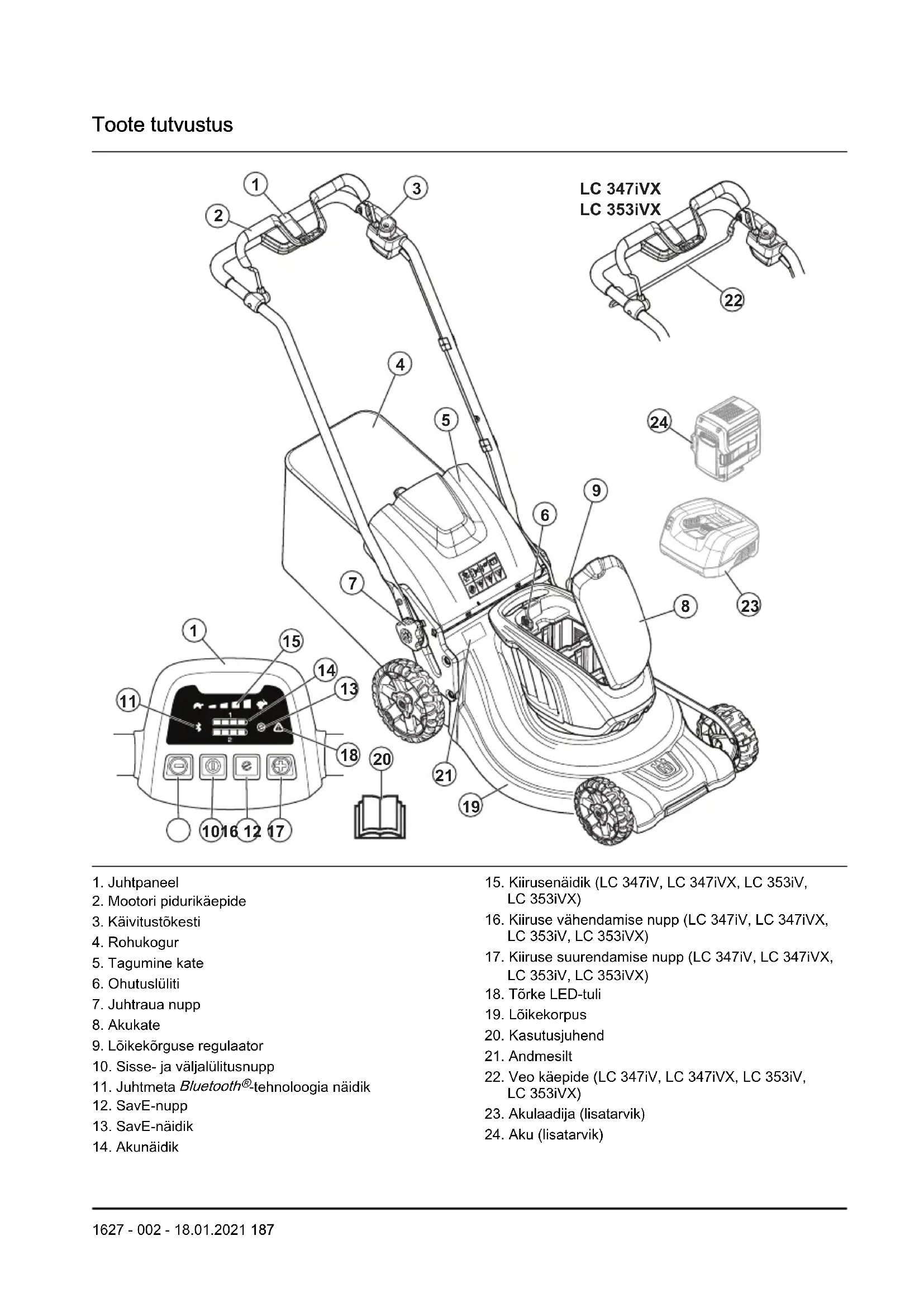 -tehnoloogia raadiosage- duse andmed LC 247iX LC 347iVX LC 353iVX Sagedusala, GHz 2,4–2,4835 2,4–2,4835 2,4–2,4835 Väljundvõimsus, max. dBm 4 4 4 Heakskiidetud akud Tüüp Aku mahtuvus, Ah Pinge, V Kaal, naela/kg BLi20 Liitiumioonaku 4,0 36 2,6/1,2 BLi30 Liitiumioonaku 7,7 36 4,2/1,9 BLi200 Liitiumioonaku 5,2 36 2,8/1,3 BLi300 Liitiumioonaku 9,4 36 4,1/1,9 Määratletud akude heakskiidetud akulaadijad, BLi Sisendpinge, V Sagedus, Hz Võimsus, W QC80 100-240 50-60 80 QC80F 12 0 80 QC250 100-240 50-60 250 QC330 100-240 50-60 330 QC500 100-240 50-60 500 208 1627 - 002 - 18.01.2021EÜ vastavusdeklaratsioon EÜ vastavusdeklaratsioon Husqvarna AB, SE-561 82 Huskvarna, Rootsi, tel: +46-36-146500, kinnitab käesolevaga, et muruniiduk Husqvarna LC 247i, LC 247iX, LC 347iV, LC 347iVX, LC 353iV, LC 353iVX alates aastast 2018 vastab järgmiste NÕUKOGU DIREKTIIVIDE nõuetele: