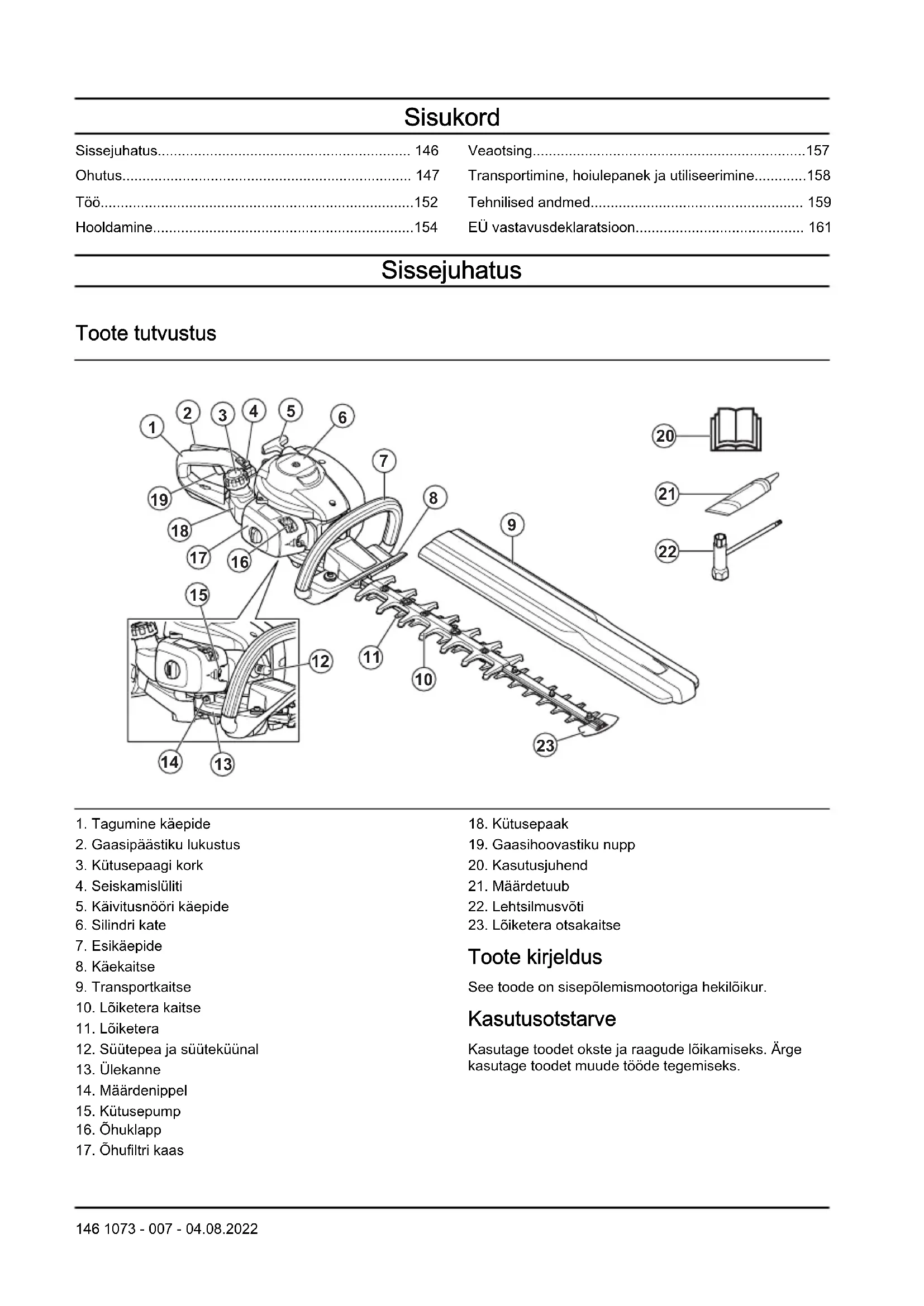 Toote kirjeldus See toode on sisepõlemismootoriga hekilõikur. Kasutusotstarve Kasutage toodet okste ja raagude lõikamiseks. Ärge kasutage toodet muude tööde tegemiseks. 146 1073 - 007 - 04.08.2022Sümbolid tootel HOIATUS! See seade on ohtlik. Hooletu või väär käsitsemine võib põhjustada kehavigastusi või surma kasutajale või juuresolijaile. Kasutaja ja juuresolijate vigastuste vältimiseks loe läbi kõik kasutusjuhendis leiduvad ohutusjuhised ja järgi neid. Enne toote kasutamist lugege kasutusjuhend hoolikalt läbi ja veenduge, et kõik juhised oleksid täiesti arusaadavad. Kasutage heakskiidetud kõrvaklappe ja kaitseprille. Kandke heakskiidetud kaitsekindaid. Kandke vastupidavaid libisemiskindlaid jalanõusid. Tühikäigu reguleerimiskruvi. Suure kiiruse segukruvi. Madala kiiruse segukruvi. Välistingimustes kasutatavate seadmete müratase vastab Euroopa direktiivi 2000/14/EÜ ja Uus Lõuna-Walesi seaduse „Protection of the Environment Operations (Noise control) Regulation 2017“ nõuetele. Toote garanteeritud helivõimsuse taseme andmed leiate jaotisest Tehnilised andmed lk 159
