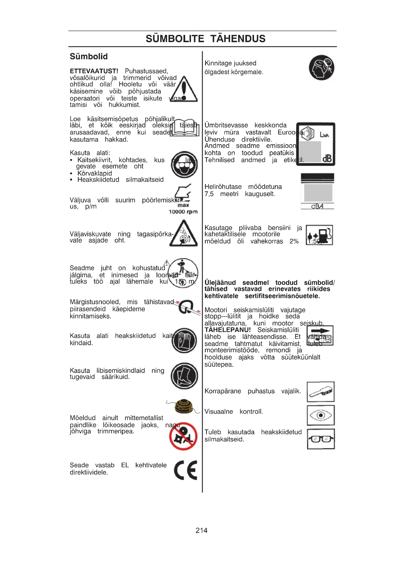 S Tee kindlaks, et tööpiirkonnas ei oleks inimesi, loomi ega midagi muud, mis võiks häirida sinu kontrolli seadme üle. S Hoolitse selle eest, et inimesed või loomad ei puudutaks lõikeosa ega saaks vigastada lõikeosast eemale paiskuvate esemete poolt. S TÄHELEPANU! Ära kasuta kunagi seadet olukordades, kus sa ei saa kutsuda abi õnnetuse korral.