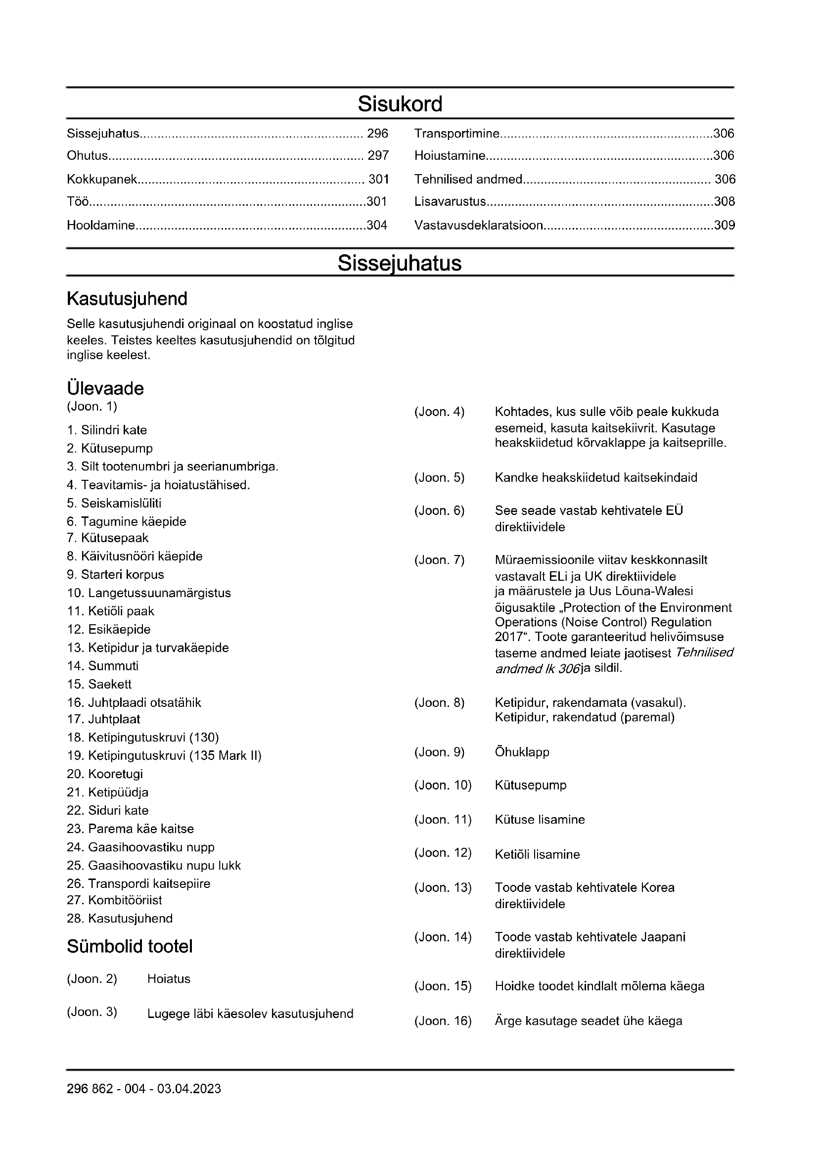 Sümbolid tootel (Joon. 2) Hoiatus (Joon. 3) Lugege läbi käesolev kasutusjuhend (Joon. 4) Kohtades, kus sulle võib peale kukkuda esemeid, kasuta kaitsekiivrit. Kasutage heakskiidetud kõrvaklappe ja kaitseprille. (Joon. 5) Kandke heakskiidetud kaitsekindaid (Joon. 6) See seade vastab kehtivatele EÜ direktiividele (Joon. 7) Müraemissioonile viitav keskkonnasilt vastavalt ELi ja UK direktiividele ja määrustele ja Uus Lõuna-Walesi õigusaktile „Protection of the Environment Operations (Noise Control) Regulation 2017“. Toote garanteeritud helivõimsuse taseme andmed leiate jaotisest Tehnilised andmed lk 306 ja sildil. (Joon. 8) Ketipidur, rakendamata (vasakul). Ketipidur, rakendatud (paremal) (Joon. 9) Õhuklapp (Joon. 10) Kütusepump (Joon. 11) Kütuse lisamine (Joon. 12) Ketiõli lisamine (Joon. 13) Toode vastab kehtivatele Korea direktiividele (Joon. 14) Toode vastab kehtivatele Jaapani direktiividele (Joon. 15) Hoidke toodet kindlalt mõlema käega (Joon. 16) Ärge kasutage seadet ühe käega 296 862 - 004 - 03.04.2023(Joon. 17) Ärge laske juhtplaadi otsal puutuda vastu objekti. (Joon. 18) See toode vastab kehtivatele UK direktiividele. Märkus: Seadmel toodud ülejäänud sümbolid/ tähised vastavad muude kommertsvaldkondade sertifitseerimisnõuetele. California Proposition 65 WARNING! The engine exhaust from this product contains chemicals known to the State of California to cause cancer, birth defects or other reproductive harm. Euro V heitmed HOIATUS: Mootori igasugune modifitseerimine, muutmine või rikkumine tühistab toote EL-i tüübikinnituse. Tootevastutus Tootevastutusseaduste alusel ei vastuta me tootest tingitud kahjustuste eest, kui: