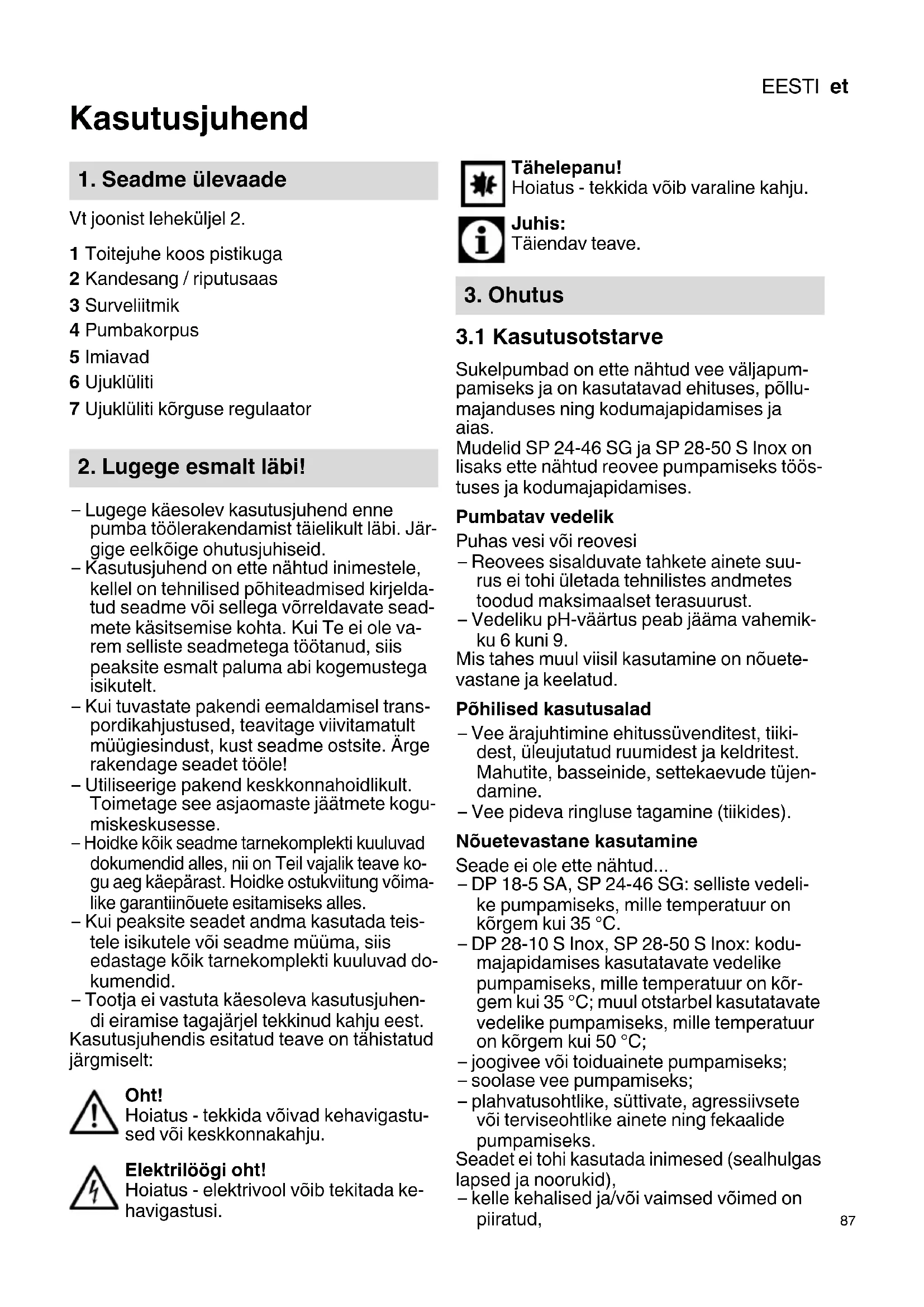 Kasutusjuhend Vt joonist leheküljel 2. – Lugege käesolev kasutusjuhend enne pumba töölerakendamist täielikult läbi. Jär- gige eelkõige ohutusjuhiseid. – Kasutusjuhend on ette nähtud inimestele, kellel on tehnilised põhiteadmised kirjelda- tud seadme või sellega võrreldavate sead- mete käsitsemise kohta. Kui Te ei ole va- rem selliste seadmetega töötanud, siis peaksite esmalt paluma abi kogemustega isikutelt. – Kui tuvastate pakendi eemaldamisel trans- pordikahjustused, teavitage viivitamatult müügiesindust, kust seadme ostsite. Ärge rakendage seadet tööle! – Utiliseerige pakend keskkonnahoidlikult. Toimetage see asjaomaste jäätmete kogu- miskeskusesse. – Hoidke kõik seadme tarnekomplekti kuuluvad dokumendid alles, nii on Teil vajalik teave ko- gu aeg käepärast. Hoidke ostukviitung võima- like garantiinõuete esitamiseks alles. – Kui peaksite seadet andma kasutada teis- tele isikutele või seadme müüma, siis edastage kõik tarnekomplekti kuuluvad do- kumendid. – Tootja ei vastuta käesoleva kasutusjuhen- di eiramise tagajärjel tekkinud kahju eest. Kasutusjuhendis esitatud teave on tähistatud järgmiselt: Oht! Hoiatus - tekkida võivad kehavigastu- sed või keskkonnakahju. Elektrilöögi oht! Hoiatus - elektrivool võib tekitada ke- havigastusi. Tähelepanu! Hoiatus - tekkida võib varaline kahju. Juhis: Täiendav teave.