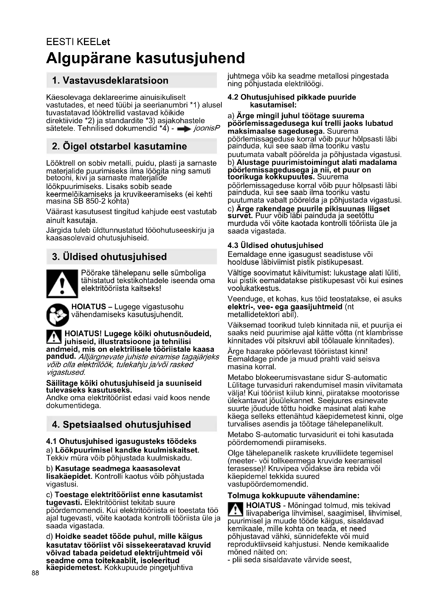 Algupärane kasutusjuhend Käesolevaga deklareerime ainuisikuliselt vastutades, et need tüübi ja seerianumbri *1) alusel tuvastatavad lööktrellid vastavad kõikide direktiivide *2) ja standardite *3) asjakohastele sätetele. Tehnilised dokumendid *4) - joonisP Lööktrell on sobiv metalli, puidu, plasti ja sarnaste materjalide puurimiseks ilma löögita ning samuti betooni, kivi ja sarnaste materjalide löökpuurimiseks. Lisaks sobib seade keermelõikamiseks ja kruvikeeramiseks (ei kehti masina SB 850-2 kohta) Väärast kasutusest tingitud kahjude eest vastutab ainult kasutaja. Järgida tuleb üldtunnustatud tööohutuseeskirju ja kaasasolevaid ohutusjuhiseid. Pöörake tähelepanu selle sümboliga tähistatud tekstikohtadele iseenda oma elektritööriista kaitseks! HOIATUS – Lugege vigastusohu vähendamiseks kasutusjuhendit. HOIATUS! Lugege kõiki ohutusnõudeid, juhiseid, illustratsioone ja tehnilisi andmeid, mis on elektrilisele tööriistale kaasa pandud. Alljärgnevate juhiste eiramise tagajärjeks võib olla elektrilöök, tulekahju ja/või rasked vigastused. Säilitage kõiki ohutusjuhiseid ja suuniseid tulevaseks kasutuseks. Andke oma elektritööriist edasi vaid koos nende dokumentidega.