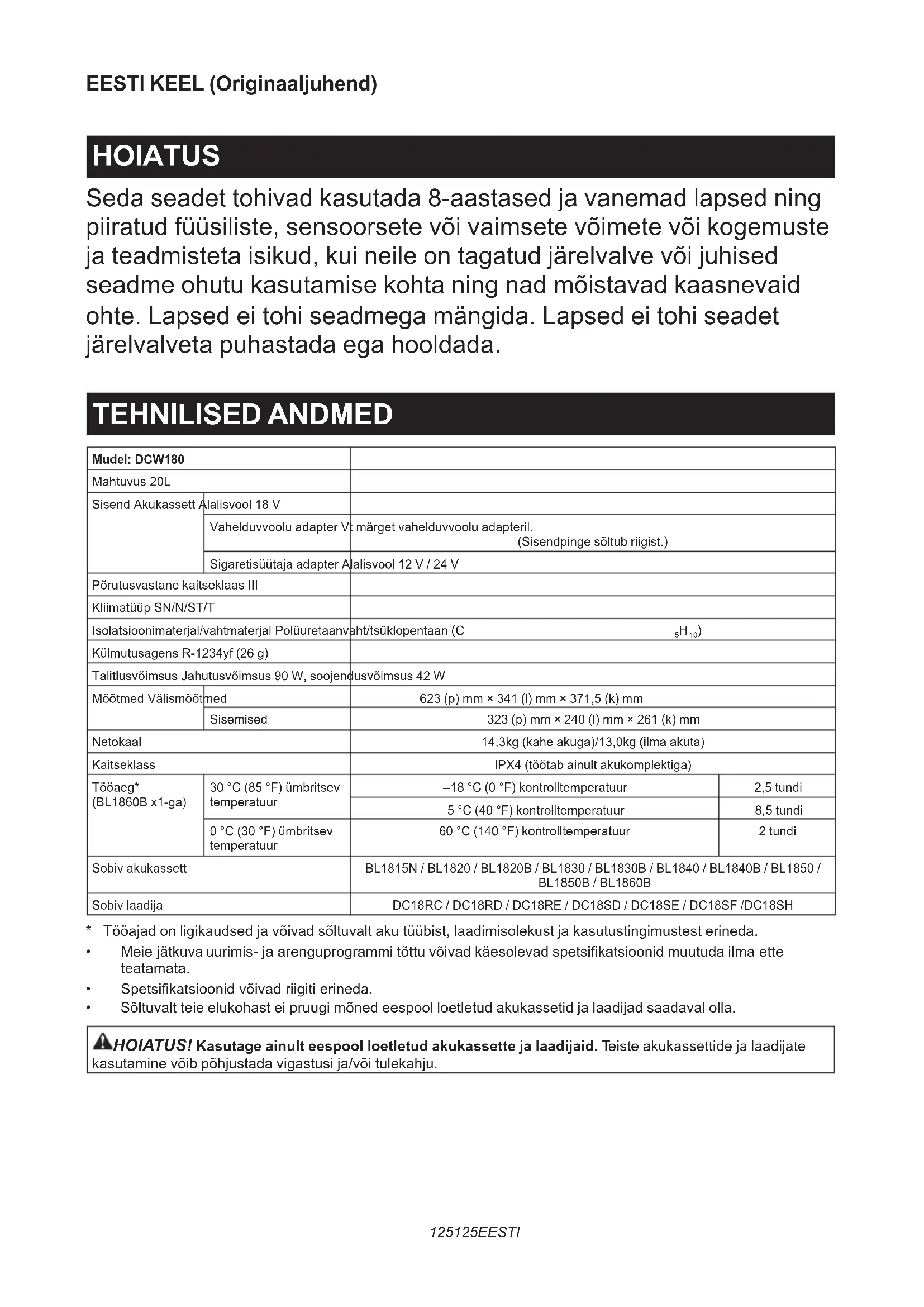 EESTI KEEL (Originaaljuhend) HOIATUS Seda seadet tohivad kasutada 8-aastased ja vanemad lapsed ning piiratud füüsiliste, sensoorsete või vaimsete võimete või kogemuste ja teadmisteta isikud, kui neile on tagatud järelvalve või juhised seadme ohutu kasutamise kohta ning nad mõistavad kaasnevaid ohte. Lapsed ei tohi seadmega mängida. Lapsed ei tohi seadet järelvalveta puhastada ega hooldada. TEHNILISED ANDMED Mudel: DCW180Mahtuvus 20LSisend Akukassett Alalisvool 18 VVahelduvvoolu adapter Vt märget vahelduvvoolu adapteril.(Sisendpinge sõltub riigist.)Sigaretisüütaja adapter Alalisvool 12 V / 24 VPõrutusvastane kaitseklaas IIIKliimatüüp SN/N/ST/TIsolatsioonimaterjal/vahtmaterjal Polüuretaanvaht/tsüklopentaan (C