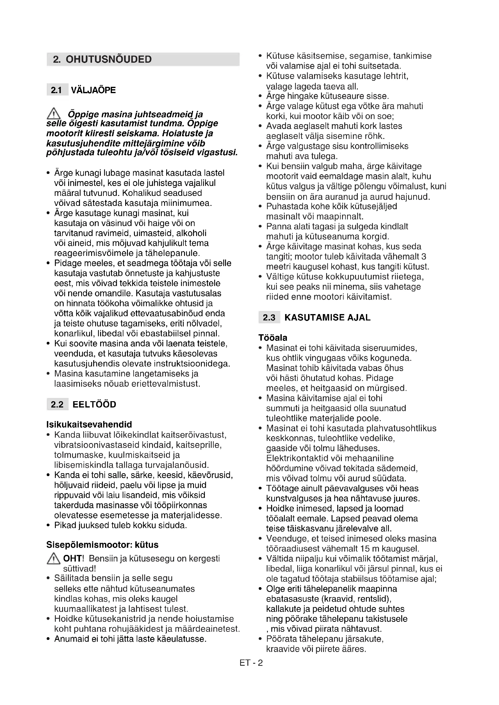 - Pikad juuksed tuleb kokku siduda. Sisepõlemismootor: kütus OHT! Bensiin ja kütusesegu on kergesti süttivad!