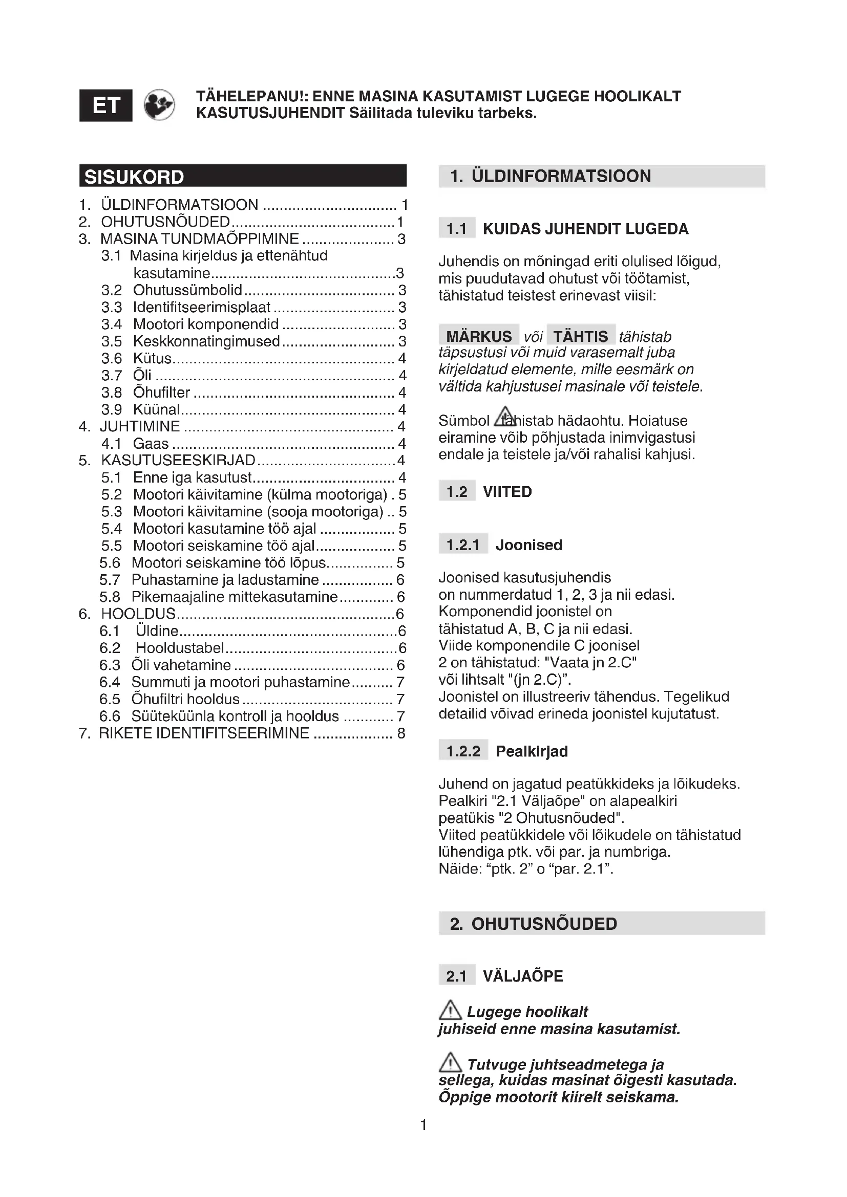 Lugege hoolikalt juhiseid enne masina kasutamist. Tutvuge juhtseadmetega ja sellega, kuidas masinat õigesti kasutada. Õppige mootorit kiirelt seiskama. TÄHELEPANU!: ENNE MASINA KASUTAMIST LUGEGE HOOLIKALT KASUTUSJUHENDIT Säilitada tuleviku tarbeks.