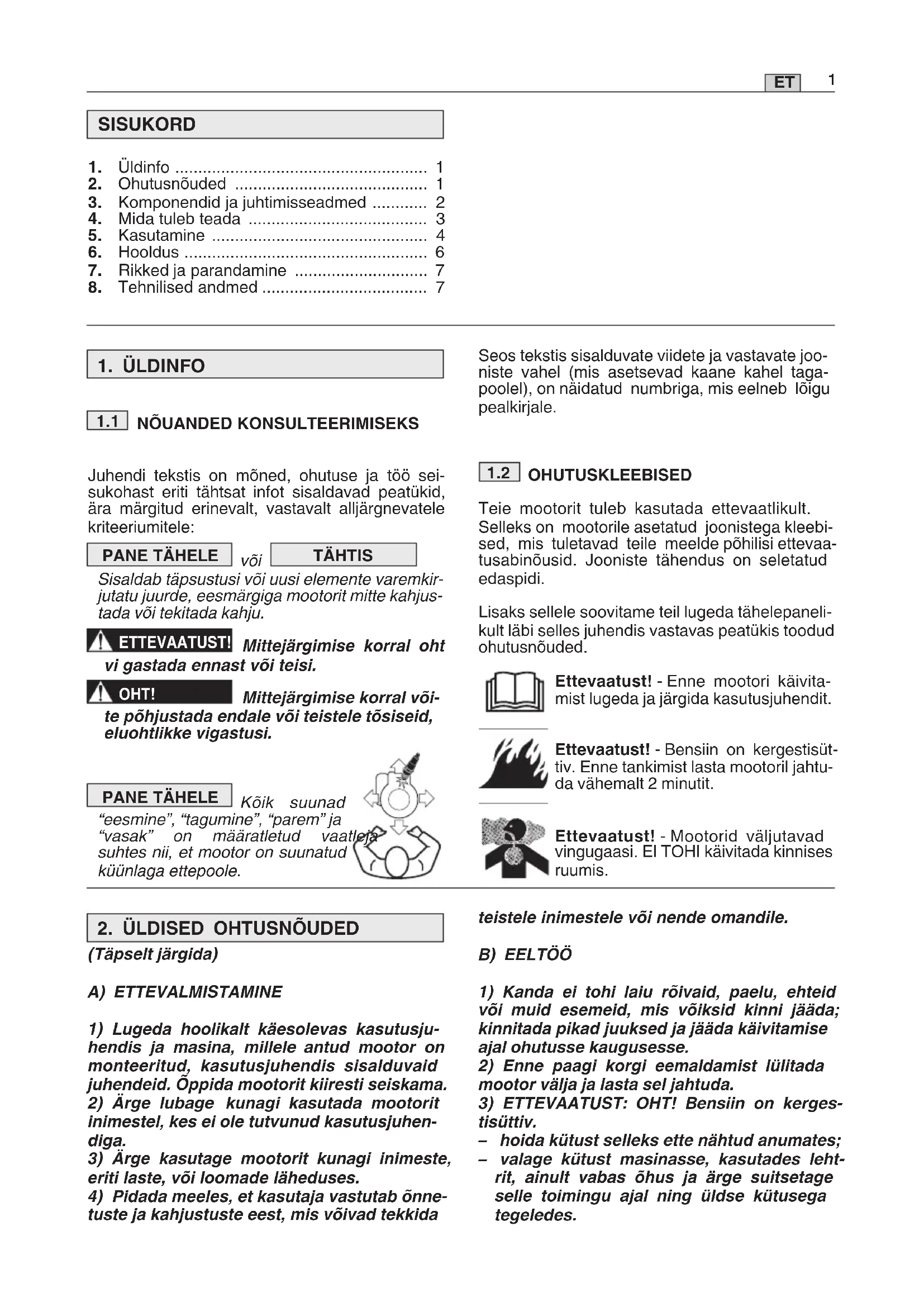 OHUTUSKLEEBISED Teie mootorit tuleb kasutada ettevaatlikult. Selleks on mootorile asetatud joonistega kleebi- sed, mis tuletavad teile meelde põhilisi ettevaa- tusabinõusid. Jooniste tähendus on seletatud edaspidi. Lisaks sellele soovitame teil lugeda tähelepaneli- kult läbi selles juhendis vastavas peatükis toodud ohutusnõuded. Ettevaatust! - Enne mootori käivita- mist lugeda ja järgida kasutusjuhendit. Ettevaatust! - Bensiin on kergestisüt- tiv. Enne tankimist lasta mootoril jahtu- da vähemalt 2 minutit. Ettevaatust! - Mootorid väljutavad vingugaasi. EI TOHI käivitada kinnises ruumis.