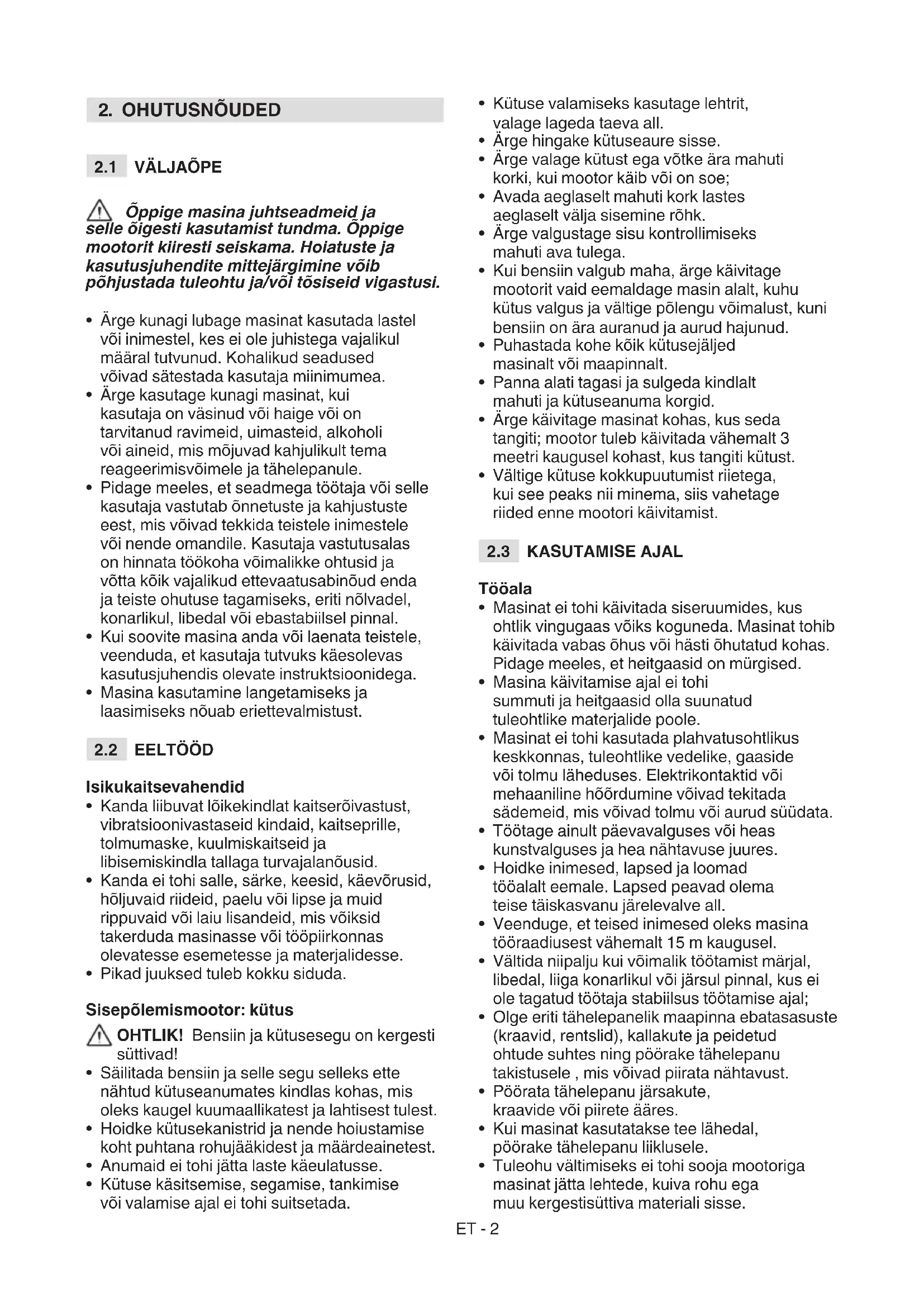 - Pikad juuksed tuleb kokku siduda. Sisepõlemismootor: kütus OHTLIK! Bensiin ja kütusesegu on kergesti süttivad!
