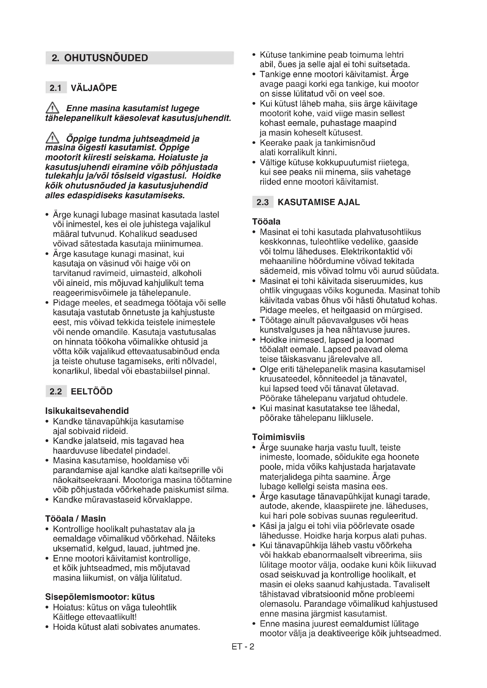 Enne masina kasutamist lugege tähelepanelikult käesolevat kasutusjuhendit. Õppige tundma juhtseadmeid ja masina õigesti kasutamist. Õppige mootorit kiiresti seiskama. Hoiatuste ja kasutusjuhendi eiramine võib põhjustada tulekahju ja/või tõsiseid vigastusi. Hoidke kõik ohutusnõuded ja kasutusjuhendid alles edaspidiseks kasutamiseks.