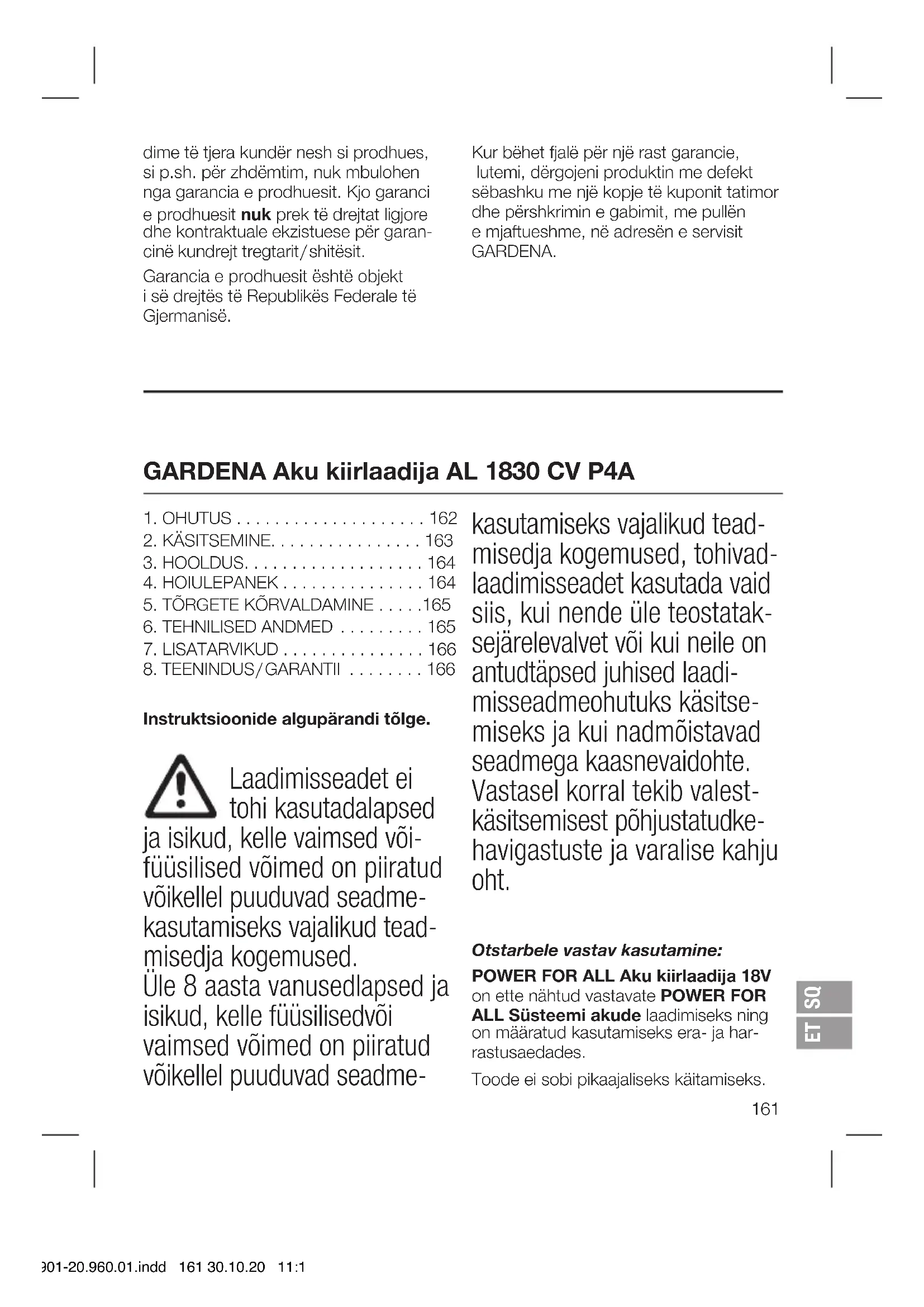 - Ostu tõendava dokumendi esitamine. Osade ja komponentide tavapärane kulu- mine (näiteks teradel, terade kinnitusde- tailidel, turbiinidel, valgustusseadmetel, kiil- ja hammasrihmadel, tiivikutel, õhufilt- ritel, süüteküünaldel), visuaalsed muu- tused ning kuluosad ja kulumaterjalidest osad on garantiist välistatud. Tootja garantii piirdub asendustarne ja parandamisega vastavalt eespoolnimeta- tud tingimustele. Teised meie kui tootja Aku kiirlaadija AL 1830 CV P4A Ühik Väärtus (art. nr. 14901) Laadimistemperatuuri lubatud vahemik °C 0 – 45 Kaal vastavalt EPTA protseduurile 01:2014 kg 0,40 Kaitseklass / II Sobivad POWER FOR ALL süsteemi akud: PBA 18V. 14901-20.960.01.indd 166 30.10.20 11:12vastu suunatud nõuded, näiteks kahju hüvitamiseks, ei ole tootja garantiiga põh- jendatud. Käesolev tootja garantii ei puuduta loomulikult edasimüüja / müüja vastu esitatavaid seadustes ja lepingutes sätestatud garantii täitmisnõudeid. Tootja garantii puhul kohaldatakse Saksamaa Liitvabariigi õigusnorme. Garantiijuhtumi korral saatke palun defektne toode koos ostu tõendava dokumendi koopia ja vea kirjeldusega piisavalt frankeerituna GARDENA teeninduse aadressile.