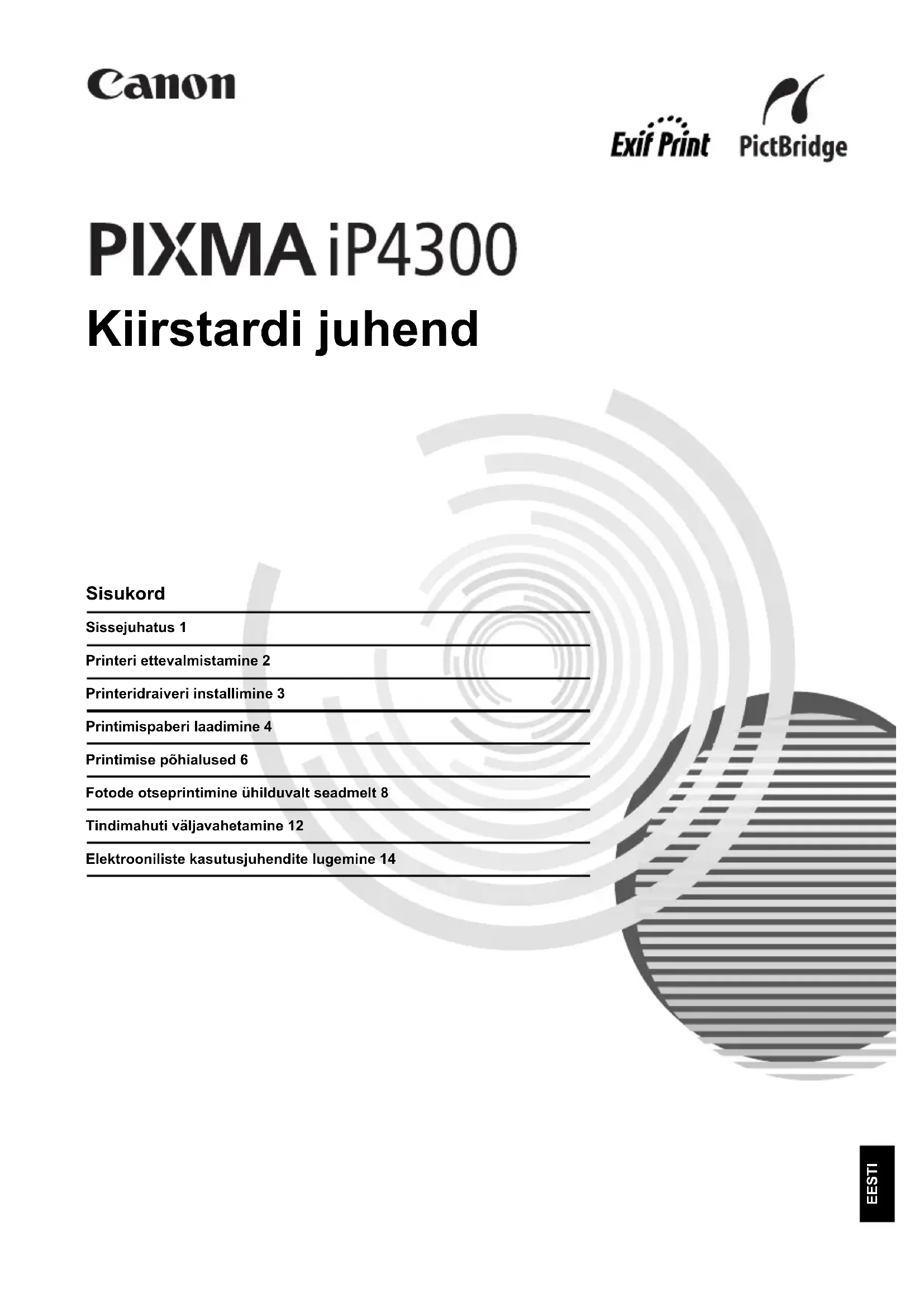 on rahvusvaheline programm, mille abil toetatakse energiasäästlike arvutite ja muu kontoritehnika tootmist. Programm toetab energiakulu tõhusalt vähendavate funktsioonidega seadmete väljatöötamist ja kasutuselevõttu. Tegemist on avatud süsteemiga, milles osalemine on ettevõtetele vabatahtlik. Sihttooted on kontoriseadmed (nt arvutid, kuvarid, printerid, faksid ja paljundusmasinad). Standardid ja logod on kõigis osalevates riikides ühesugused Toitenõuded Ärge kunagi kasutage toiteallikat, mille pinge erineb seadme osturiigis kasutatavast pingest. Vale pinge võib põhjustada tulekahju või elektrilöögi ohu. Toiteallika õige pinge ja sagedus on järgmised: Vahelduvvool 100-240 V, 50/60 Hz Lisatarvikute teave Lisatarvikud (tindimahutid / FINE-kassetid (FINE Cartridges)) on saadaval viis aastat pärast tootmise lõpetamist. Ohutusnõuded Hoiatus z Ärge kunagi proovige toitejuhet vooluvõrku ühendada või vooluvõrgust eemaldada märgade kätega! z Ärge toitejuhet kahjustage, muutke, venitage, liigselt painutage ega keerake! Ärge asetage toitejuhtmele raskeid esemeid. z Ärge kasutage osturiigis saadaolevatest standardsetest toiteplokkidest erinevat toiteallikat! Vale pinge ja sagedusega toite kasutamine võib põhjustada tulekahju või elektrilöögi ohu.z Lükake pistik vooluvõrgu pistikupessa alati lõpuni. Ettevaatust! z Ohutuse huvides säilitage tindimahuteid väikelaste käeulatusest eemal. z Ärge pillake tindimahuteid maha ega raputage neid, kuna nii võib tint lekkida ja teie riideid või käsi määrida. Lugege ka ohutusnõudeid [User's guide/Kasutusjuhend] elektroonilisest juhendist. Kehavigastuste või printeri kahjustamise vältimiseks järgige ettevaatusabinõusid ja hoiatusi. Mudeli number: K10284 (iP4300)1Sissejuhatus EESTI Sissejuhatus Suur tänu Canon Inkjet Printeri ostmise eest! Käesolevas Kiirstardi juhendis on oluline teave tähistatud järgmiste sümbolitega. Järgige alati nende sümbolitega tähistatud juhiseid. Hoiatus Juhised, mille eiramisel võivad hälbed seadme töös põhjustada surma või raskeid kehavigastusi. Seadme ohutuks kasutamiseks peab neid juhiseid järgima. Ettevaatust! Juhised, mille eiramisel võivad hälbed seadme töös põhjustada kehavigastusi või materiaalset kahju. Seadme ohutuks kasutamiseks peab neid juhiseid järgima. NB! Juhised, mida peab järgima seadme ohutuks kasutamiseks. Kaubamärgiteave z „Windows” ja „Internet Explorer” on Microsoft Corporation kaubamärgid ning need on registreeritud Ameerika Ühendriikides ja teistes riikides. z „Macintosh“ ja „Mac“ on Apple Computer, Inc. kaubamärgid, mis on registreeritud Ameerika Ühendriikides ja muudes riikides. z „Adobe” ja „Adobe RGB (1998)” on kas eraldi registreeritud kaubamärgid või Adobe Systems Incorporated kaubamärgid Ameerika Ühendriikides ja/või teistes maades. Autoriõigus ©2006 CANON INC. Kõik õigused on reserveeritud. Ilma kirjaliku loata ei tohi käesoleva juhendi ühtegi osa mitte mingil kujul edastada ega kopeerida.2 Printeri ettevalmistamine EESTI Printeri ettevalmistamine Lugege enne printeri üles- ning selle kasutamisvalmis seadmist kindlasti häälestusdokumenti. 1 Lülitage printer sisse. 2 Paigaldage prindipea. 3 Paigaldage tindimahutid. 4 Laadige paber printerisse. Järgneva toimingu jooksul peate teostama prindipea joonndamise, milleks vajate lehte A4 või Letter-formaadis tavapaberit automaatlehesööturisse asetatuna. Ettevaatust! Eemaldage kindlasti enne printeri sisselülitamist kaitseribad. Märkus. Kaitseriba asukoht võib joonisel näidatust erineda. Ettevaatust! Ärge puudutage muid sisemisi osi peale prindipea lukustushoova. NB! Kui esikaas on avatud üle kümne minuti, nihkub prindipea hoidik paremasse serva. Sel juhul sulgege esikaas ja avage uuesti. Märkus. z Koti sisemuses, milles prindipea kohale toimetatakse, või kaitsekatte sees võib leiduda veidi läbipaistvat või helesinist tinti – see ei mõjuta mingil viisil prindi kvaliteeti. Olge ettevaatlik, et te ei määriks end neid esemeid käsitsedes tindiga.z Ärge proovige kord eemaldatud kaitsekaant uuesti kinnitada. NB! z Kindlustage, et kõik tindimahutid on õiges asendis paigaldatud ning ühtiksid tähistusega. Printerit ei saa kasutada, kui mõni tindimahuti on paigaldamata. z Olles tindimahutid paigaldanud, hakkab märgutuli POWER (TOIDE) rohelisena vilkuma. Oodake enne jätkamist umbes 2 minutit, kuni märgutuli POWER (TOIDE) lõpetab vilkumise ja muutub püsivaks roheliseks ning printeri tööhääled on vaikinud. Märkus. z Eemaldage läbipaistev kile tindimahuti küljest kindlasti häälestusdokumendis 3. juhises toodud järjekorras. z Ärge pigistage tindimahutite külgi, kuna nii võib tint lekkida ja teie riideid või käsi määrida. z Ärge kinnitage kaitsekaant pärast selle eemaldamist uuesti. z Kui mõni tindimahuti pole õigesti paigaldatud, jääb signaaluli ALARM (HÄIRE) oranžilt vilkuma. Avage esikaas ning kõigi tindimahutite asendid vastavad tähisele. NB! z Paberi laadimisel automaatlehesööturisse veenduge, et märgutuli Automaatlehesöötur põleb. z Asetage paber seadmesse alati vertikaalsuunas. Paberi horisontaalsuunas seadmesse asetamine võib põhjustada paberiummistust.3Printeridraiveri installimine EESTI Printeridraiveri installimine Operatsioonisüsteemide Windows