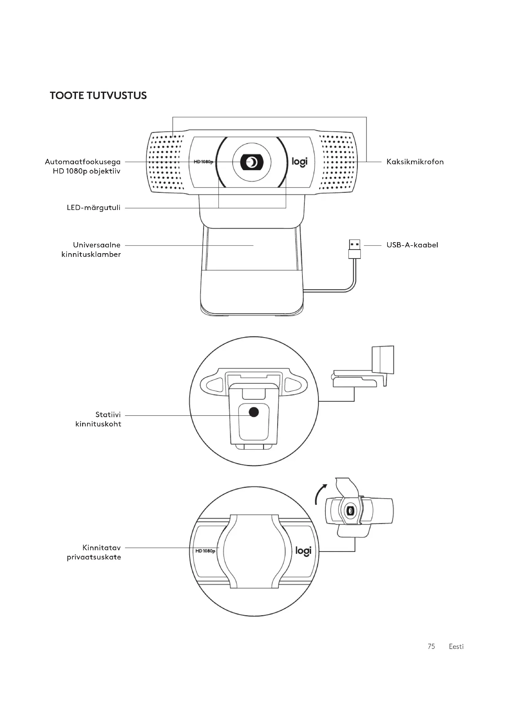 www.logitech.com/support/C920e ©Logitech, 2020. Logitech, Logi та емблема Logitech є товарними знаками або зареєстрованими товарнимизнаками компанії Logitech Europe S.A. і (або) її дочірніх компаній у США та інших країнах. Logitech не несе відповідальності за можливі помилки в цьому посібнику. Його зміст може бути змінено безпопереднього сповіщення.Automaatfookusega HD 1080p objektiiv LED-märgutuli Universaalne kinnitusklamber Statiivi kinnituskoht Kinnitatav privaatsuskate USB-A-kaabel TOOTE TUTVUSTUS Kaksikmikrofon 75 EestiPRIVAATSUSKATTE KINNITAMINE 1 Kinnitage väline privaatsuskate, tehes kindlaks veebikaamera objektiivi asukoha. KARBI SISU 1 Veebikaamera koos 1,5 m (1.5 jala) pikkuse USB-A-kaabliga 2 Privaatsuskate 3 Kasutaja dokumentatsioon USB-A 2 Klõpsake kate veebikaamera esiküljele, otsekeskosa peale. 3 Kohendage privaatsuskatet käsitsi oma soovi järgi kas avatud või suletud asendisse. 76 EestiVEEBIKAAMERA SEADISTAMINE Monitori külge kinnitamiseks 1 Asetage veebikaamera arvutile, sülearvutile võimonitorile soovitud asendis või nurga all. Statiivi* külge kinnitamiseks 1 1/4 tolline statiivi kinnituskoht asub universaalse kinnitusklambri alaosas. 2 Reguleerige veebikaamerat ja veenduge, etuniversaalse kinnitusklambri jalg oleks seadme tagaküljega samal tasapinnal. 3 Reguleerige veebikaamerat käsitsi üles/alla, et saavutada parim asend enda kaadrisse püüdmiseks. 2 Kinnitage veebikaamera statiivile, pöörates statiivi ¼-tollise keerme sisse. 3 Asetage statiivil veebikaamera oma soovi järgi enda kõige paremini kaadrisse saamiseks sobivasse asukohta.