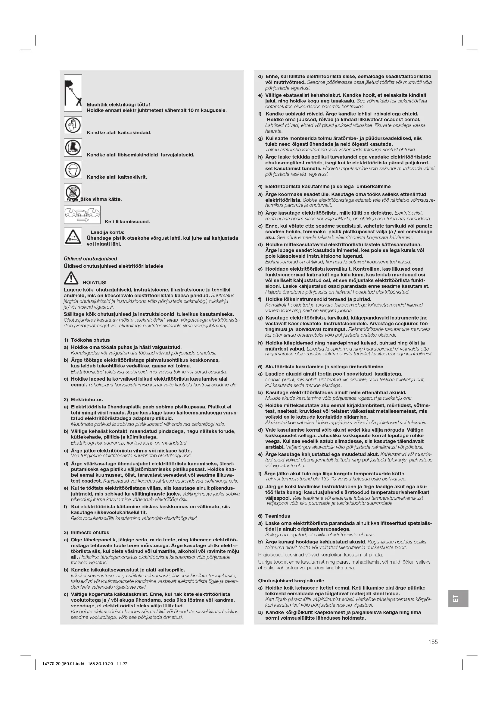 a) Laske oma elektritööriista parandada ainult kvalifitseeritud spetsialis- tidel ja ainult originaalvaruosadega. Sellega on tagatud, et säiliks elektritööriista ohutus. b) Ärge kunagi hooldage kahjustatud akusid. Kogu akude hooldus peaks toimuma ainult tootja või volitatud klienditeenin duskeskuste poolt. Riigisisesed eeskirjad võivad kõrglõikuri kasutamist piirata. Uurige toodet enne kasutamist ning pärast mahapillamist või muid lööke, selleks et olulisi kahjustusi või puudusi kindlaks teha. Ohutusjuhised kõrglõikurile a) Hoidke kõik kehaosad ketist eemal. Keti liikumise ajal ärge püüdke lõikmeid eemaldada ega lõigatavat materjali kinni hoida. Kett liigub pärast lüliti väljalülitamist edasi. Hetkeline tähelepanematus kõrglõi- kuri kasutamisel võib põhjustada raskeid vigastusi. b) Kandke kõrglõikurit käepidemest ja paigalseisva ketiga ning ilma sõrmi võimsuslülitite läheduses hoidmata. 14770-20.960.01.indd 155 30.10.20 11:27ET