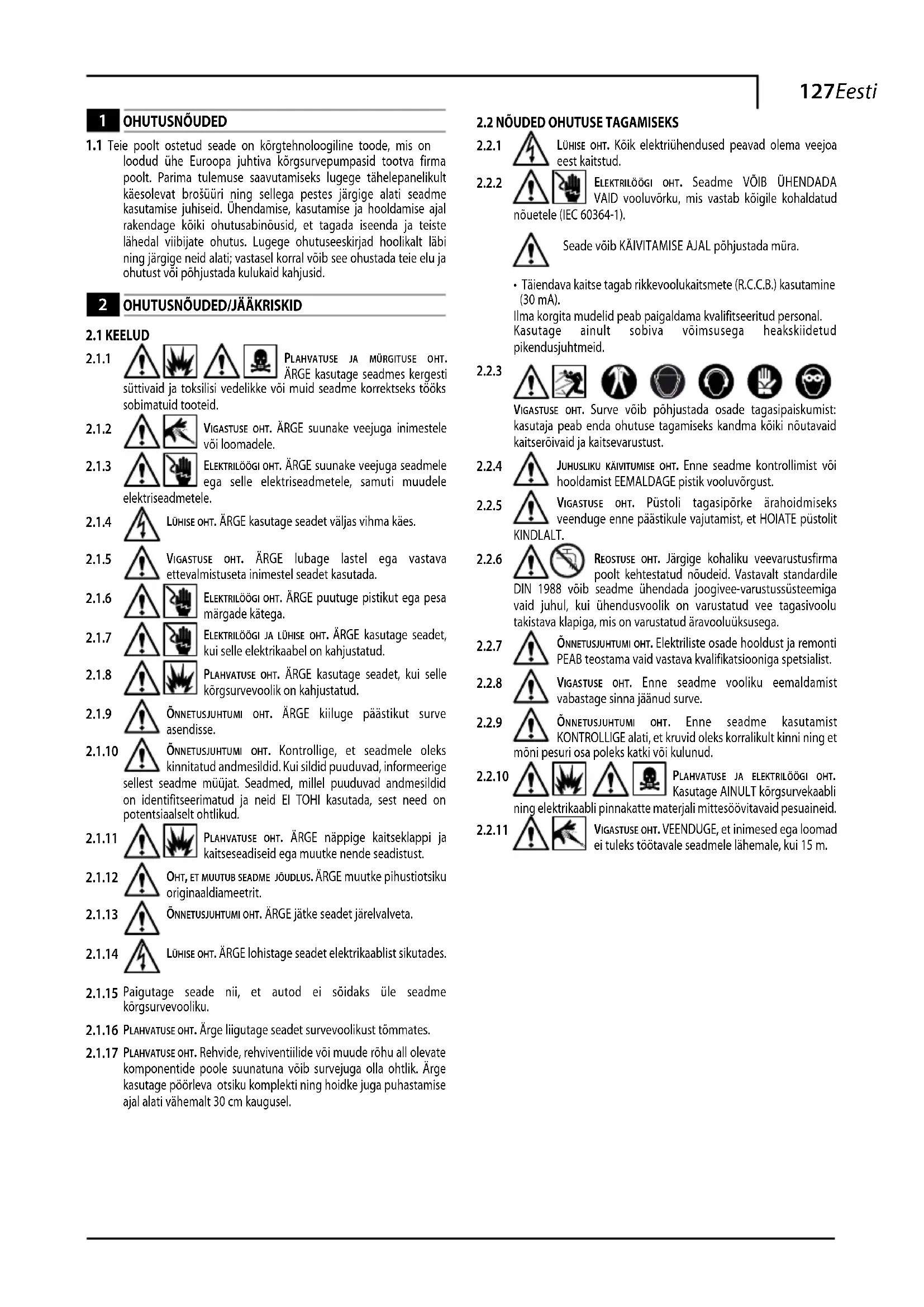 vigastuse oht. VEENDUGE, et inimesed ega loomad ei tuleks töötavale seadmele lähemale, kui 15 m.128 Eesti