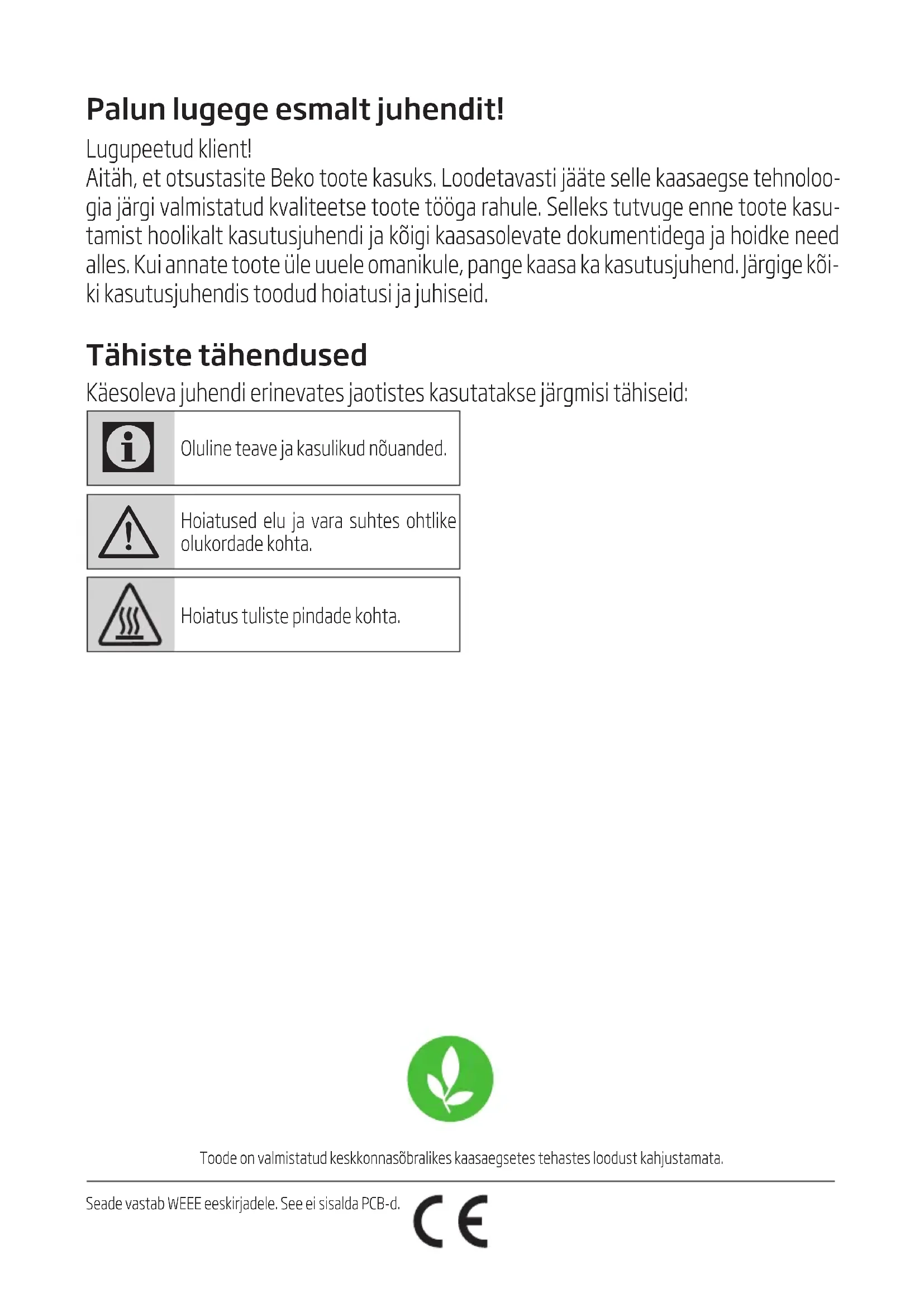 apačioje yra nešvarumų. Norėdami išvalyti nešvarumus, žr. skyrių „Valymas ir priežiūra“.Palun lugege esmalt juhendit! Lugupeetud klient! Aitäh, et otsustasite Beko toote kasuks. Loodetavasti jääte selle kaasaegse tehnoloo- gia järgi valmistatud kvaliteetse toote tööga rahule. Selleks tutvuge enne toote kasu- tamist hoolikalt kasutusjuhendi ja kõigi kaasasolevate dokumentidega ja hoidke need alles. Kui annate toote üle uuele omanikule, pange kaasa ka kasutusjuhend. Järgige kõi- ki kasutusjuhendis toodud hoiatusi ja juhiseid. Tähiste tähendused Käesoleva juhendi erinevates jaotistes kasutatakse järgmisi tähiseid: