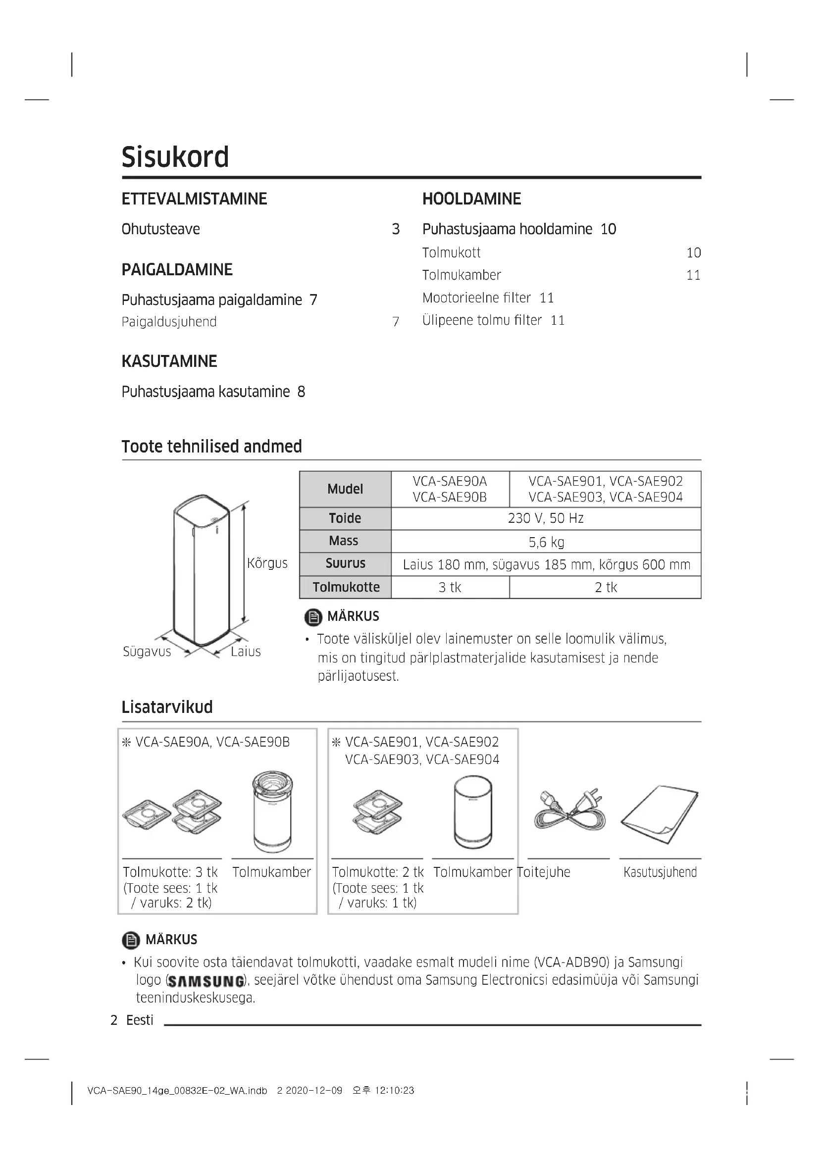 - Kui soovite osta täiendavat tolmukotti, vaadake esmalt mudeli nime (VCA-ADB90) ja Samsungi logo ( ), seejärel võtke ühendust oma Samsung Electronicsi edasimüüja või Samsungi teeninduskeskusega. VCA-SAE90_14ge_00832E-02_WA.indb 2 2020-12-09 오후 12:10:23Eest i