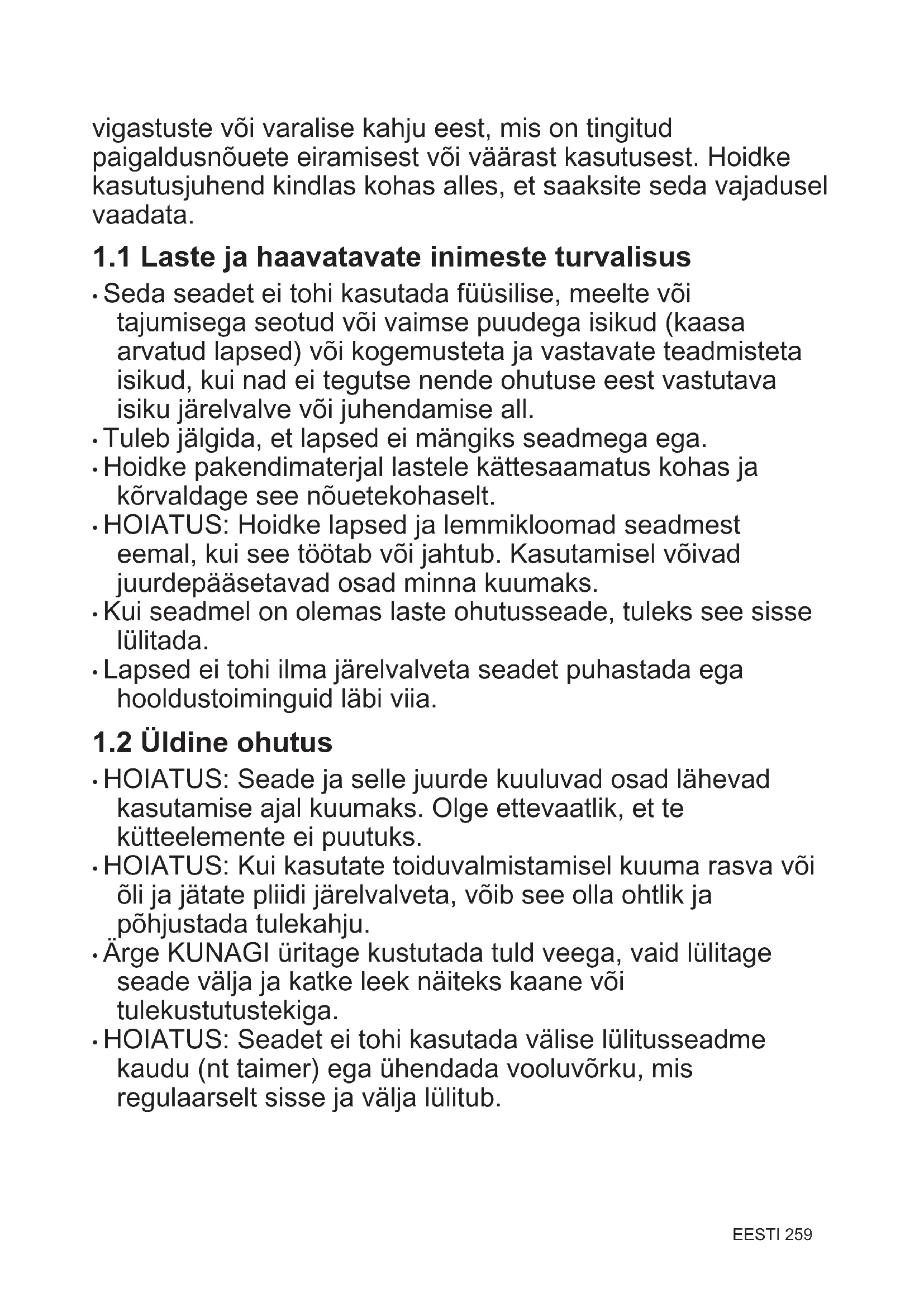 - HOIATUS: Seadet ei tohi kasutada välise lülitusseadme kaudu (nt taimer) ega ühendada vooluvõrku, mis regulaarselt sisse ja välja lülitub. EESTI 259• ETTEVAATUST: Valmival toidul tuleb silm peal hoida. Lühiajalise toiduvalmistamise puhul ei tohi pliidi juurest lahkuda.