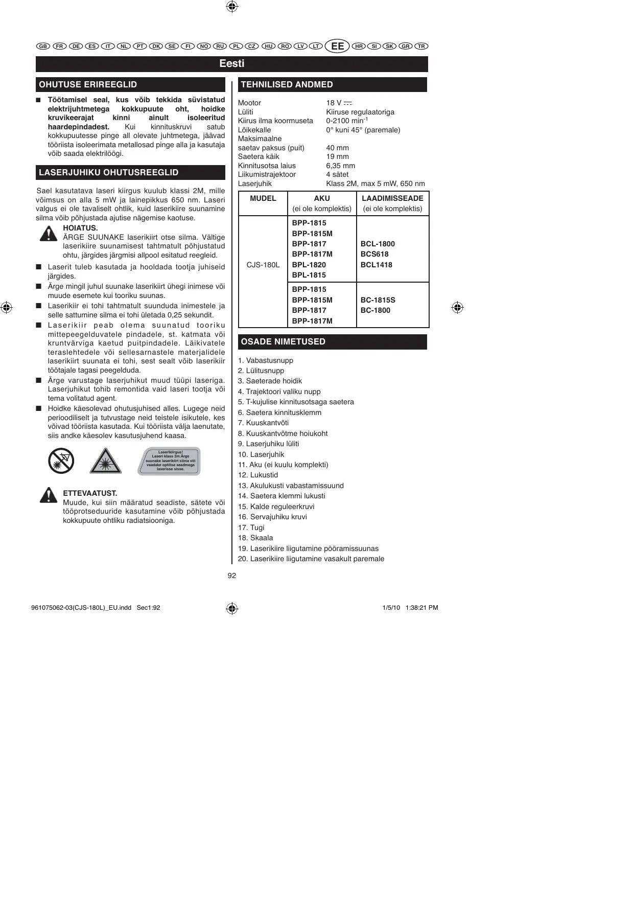 TEHNILISED ANDMED Töötamisel seal, kus võib tekkida süvistatud elektrijuhtmetega kokkupuute oht, hoidke kruvikeerajat kinni ainult isoleeritud haardepindadest. Kui kinnituskruvi satub kokkupuutesse pinge all olevate juhtmetega, jäävad tööriista isoleerimata metallosad pinge alla ja kasutaja võib saada elektrilöögi. Mootor Lüliti Kiirus ilma koormuseta Lõikekalle Maksimaalne saetav paksus (puit) Saetera käik Kinnitusotsa laius Liikumistrajektoor Laserjuhik LASERJUHIKU OHUTUSREEGLID Sael kasutatava laseri kiirgus kuulub klassi 2M, mille võimsus on alla 5 mW ja lainepikkus 650 nm. Laseri valgus ei ole tavaliselt ohtlik, kuid laserikiire suunamine silma võib põhjustada ajutise nägemise kaotuse. HOIATUS. ÄRGE SUUNAKE laserikiirt otse silma. Vältige laserikiire suunamisest tahtmatult põhjustatud ohtu, järgides järgmisi allpool esitatud reegleid. MUDEL CJS-180L Q Laserit tuleb kasutada ja hooldada tootja juhiseid järgides. Q Ärge mingil juhul suunake laserikiirt ühegi inimese või muude esemete kui tooriku suunas. Q Laserikiir ei tohi tahtmatult suunduda inimestele ja selle sattumine silma ei tohi ületada 0,25 sekundit. Q L a s e r i k i i r p e a b o l e m a s u u n a t u d t o o r i k u mittepeegelduvatele pindadele, st. katmata või kruntvärviga kaetud puitpindadele. Läikivatele teraslehtedele või sellesarnastele materjalidele laserikiirt suunata ei tohi, sest sealt võib laserikiir töötajale tagasi peegelduda. Q Ärge varustage laserjuhikut muud tüüpi laseriga. Laserjuhikut tohib remontida vaid laseri tootja või tema volitatud agent. Q Hoidke käesolevad ohutusjuhised alles. Lugege neid perioodiliselt ja tutvustage neid teistele isikutele, kes võivad tööriista kasutada. Kui tööriista välja laenutate, siis andke käesolev kasutusjuhend kaasa. 18 V Kiiruse regulaatoriga 0-2100 min-1 0° kuni 45° (paremale) 40 mm 19 mm 6,35 mm 4 sätet Klass 2M, max 5 mW, 650 nm AKU (ei ole komplektis) BPP-1815 BPP-1815M BPP-1817 BPP-1817M BPL-1820 BPL-1815 BPP-1815 BPP-1815M BPP-1817 BPP-1817M LAADIMISSEADE (ei ole komplektis) BCL-1800 BCS618 BCL1418 BC-1815S BC-1800 OSADE NIMETUSED