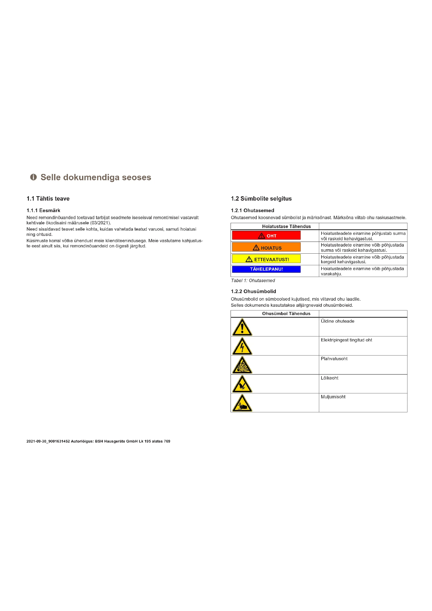 Selles dokumendis kasutatakse alljärgnevaid üldisi sümboleid. Üld. sümbol Tähendus Erinõuande tunnus (tekst ja/või graafik) Lihtsa nõuande tunnus (ainult tekst) Videojuhendi lingi tunnus Üld. sümbol Tähendus Vajalike tööriistade tunnus Vajalike eeltingimuste tunnus Seisukorra tunnus (kui..., siis...) Tulemuse tunnus Start Klahvi või nupu tunnus [00123456] Materjalinumbri tunnus Olek Kuvatava teksti/akna tunnus (seadme ek- raanil) Tabel3: Üldised sümbolid Selle dokumendiga seoses 2021-09-30_9001631452 Autoriõigus: BSH Hausgeräte GmbH Lk196alates769Ohutus