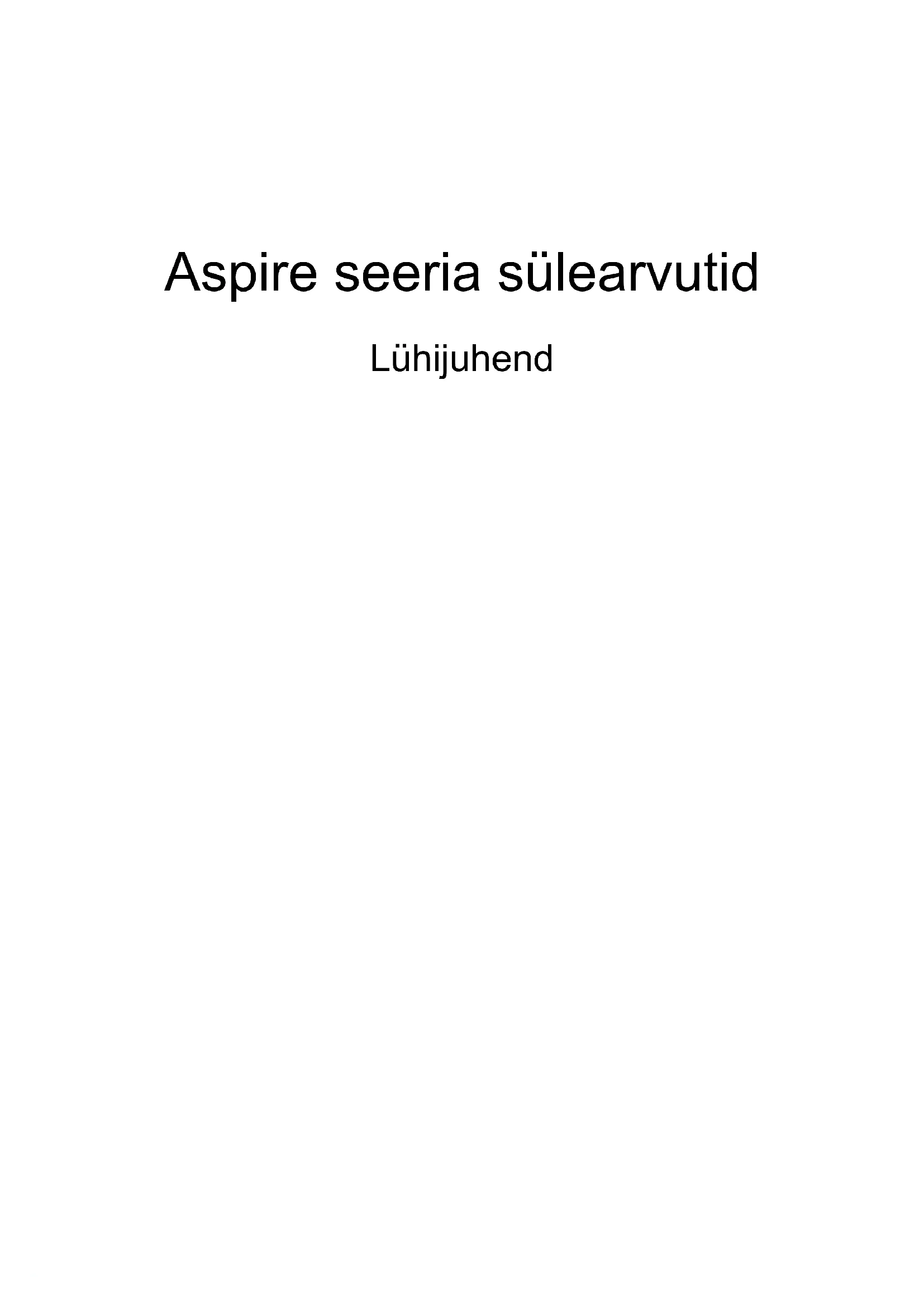 4Aspire seeria sülearvutid LühijuhendMudeli number: ________________________________ Seerianumber: _________________________________ Ostukuupäev: _________________________________ Ostukoht: _____________________________________ © 2010 Kõik õigused kaitstud. Aspire seeria sülearvutite lühijuhend Originaalväljaanne: 07/20103 Kõigepealt tähtsamad asjad Täname Teid selle eest, et valisite oma kaasaskantavaks arvutiks Acer'i sülearvuti. Teie teejuhid Et aidata Teil kasutada oma Acer'i sülearvutit, oleme loonud komplekti juhiseid: Kõigepealt aitab seadistuse poster Teil alustada oma arvuti häälestamist. Aspire üldkasutusjuhend sisaldab kõigile Aspire tooteseeria mudelitele kohalduvat kasulikku teavet. See katab põhilisi teemasid nagu klaviatuuri kasutamine, heli jne. Palume mõista, et tulenevalt nende loomusest viitavad nii Üldkasutusjuhend kui ka allpool mainitud AcerSystemi kasutaja teatmik (AcerSystem User Guide) aeg-ajalt funktsioonidele või omadustele, mis on ainult teatud seeria mudelitel, kuid mitte tingimata teie ostetud mudelil. Sellised juhtumid on tekstis märgitud väljenditega nagu „ainult teatud mudelitel”. Lühijuhend tutvustab Teile uue arvuti põhilisi omadusi ja funktsioone. Kui soovite saada rohkem teada sellest, kuidas arvuti Teil aitab produktiivsem olla, vaadake AcerSystemi kasutaja teatmik (AcerSystem User Guide). Teatmik sisaldab täpsemat informatsiooni teemadel nagu süsteemiutiilidid, andmete taastamine, laiendusvõimalused ja probleemide lahendamine. Sellele lisaks sisaldab see garantiiinformatsiooni ning sülearvuti kohta kehtivaid üldiseid regulatsioone ja ohutuseeskirju. See on saadaval PDF-formaadis (Portable Document Format) ning on laetud Teie sülearvutisse. Juhised selle avamiseks: 1 Klõpsake ja avage Start > Kõik programmid > AcerSystem. 2 Klõpsake real AcerSystemi kasutaja teatmik (AcerSystem User Guide). Märkus: Faili vaatamiseks on vaja Adobe Reader'it. Kui Adobe Reader pole arvutisse installeeritud, käivitab AcerSystemi kasutaja teatmik (AcerSystem User Guide) 'ile kõigepealt Adobe Reader'i installeerimisprogrammi. Installeerimise lõpetamiseks järgige ekraanil olevaid juhiseid. Juhiseid Adobe Reader'i kasutamiseks leiate menüüst Spikker ja tugi.4 Eesti Teie Acer’i sülearvuti ülevaade Kui olete oma arvuti häälestanud häälestuse postril kujutatud viisil, lubage meil teile tutvustada teie uut Acer’i sülearvutit. Pealtvaade