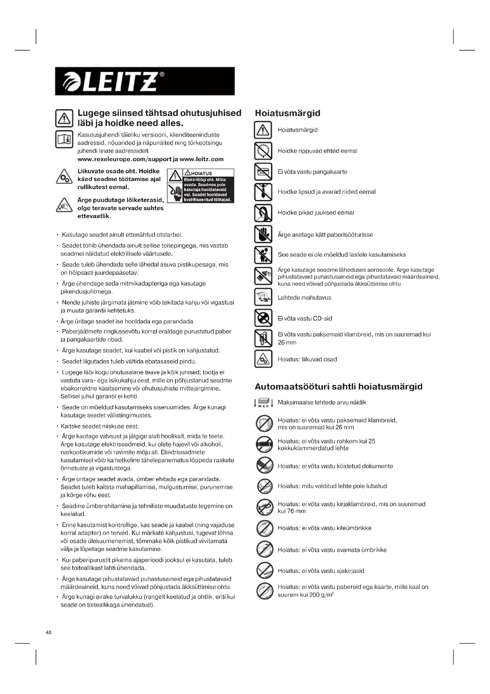 - Ärge kunagi eirake turvalukku (rangelt keelatud ja ohtlik, eriti kui seade on toiteallikaga ühendatud). Lugege siinsed tähtsad ohutusjuhised läbi ja hoidke need alles. Kasutusjuhendi täieliku versiooni, klienditeeninduste aadressid, nõuanded ja näpunäited ning tõrkeotsingu juhendi leiate aadressidelt www.rexeleurope.com/support ja www.leitz.com Hoidke rippuvad ehted eemal Hoiatusmärgid Hoiatusmärgid Ärge puudutage lõiketerasid, olge teravate servade suhtes ettevaatlik. Liikuvate osade oht. Hoidke käed seadme töötamise ajal rullikutest eemal. Hoiatus: ei võta vastu paksemaid klambreid, mis on suuremad kui 26 mm Hoiatus: ei võta vastu köidetud dokumente Hoiatus: ei võta vastu rohkem kui 25 kokkuklammerdatud lehte Automaatsööturi sahtli hoiatusmärgid Hoiatus: mitu volditud lehte pole lubatud Hoiatus: ei võta vastu kirjaklambreid, mis on suuremad kui 76 mm Maksimaalse lehtede arvu näidik Hoiatus: ei võta vastu ajakirjasid Hoiatus: ei võta vastu pabereid ega kaarte, mille kaal on suurem kui 200 g/m
