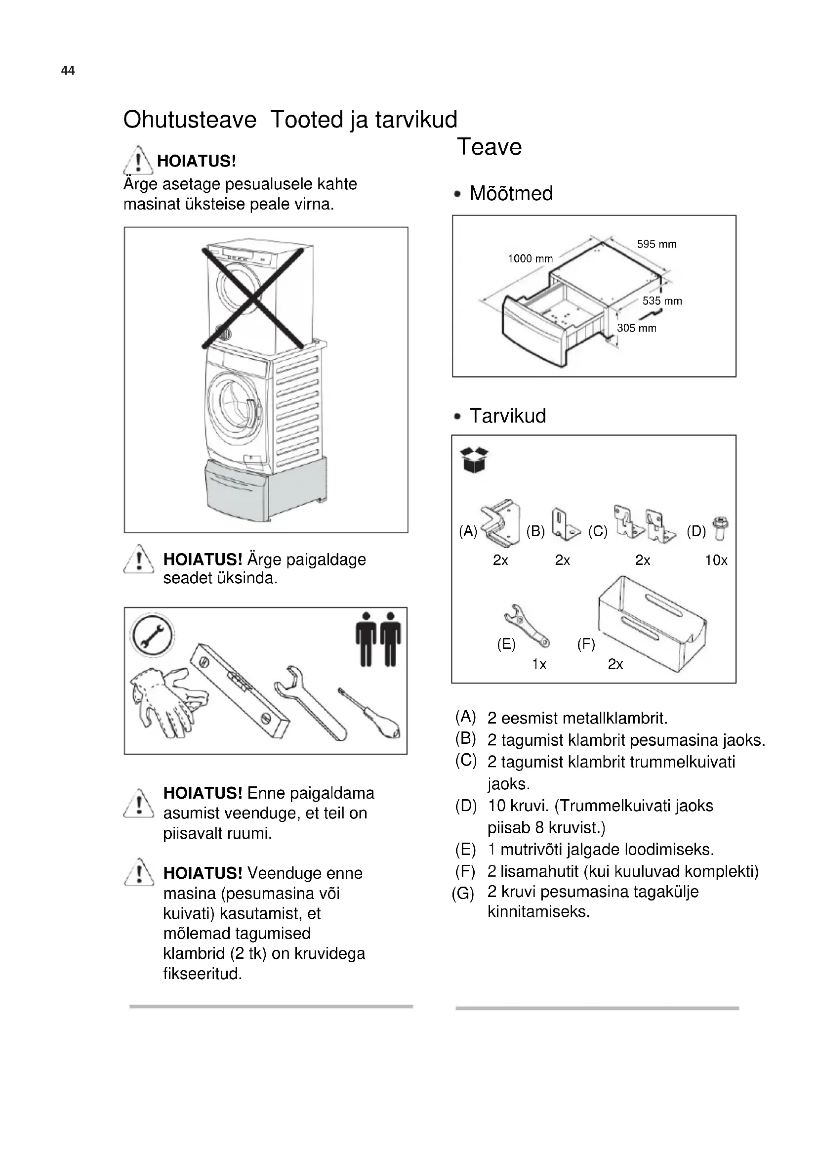 HOIATUS! Enne paigaldama asumist veenduge, et teil on piisavalt ruumi. HOIATUS! Veenduge enne masina (pesumasina või kuivati) kasutamist, et mõlemad tagumised klambrid (2 tk) on kruvidega fikseeritud. (A) (B) (C) (D) (E) (F) (G) 2 eesmist metallklambrit. 2 tagumist klambrit pesumasina jaoks. 2 tagumist klambrit trummelkuivati jaoks. 10 kruvi. (Trummelkuivati jaoks piisab 8 kruvist.) mutrivõti jalgade loodimiseks. lisamahutit (kui kuuluvad komplekti) 2 kruvi pesumasina tagakülje kinnitamiseks.