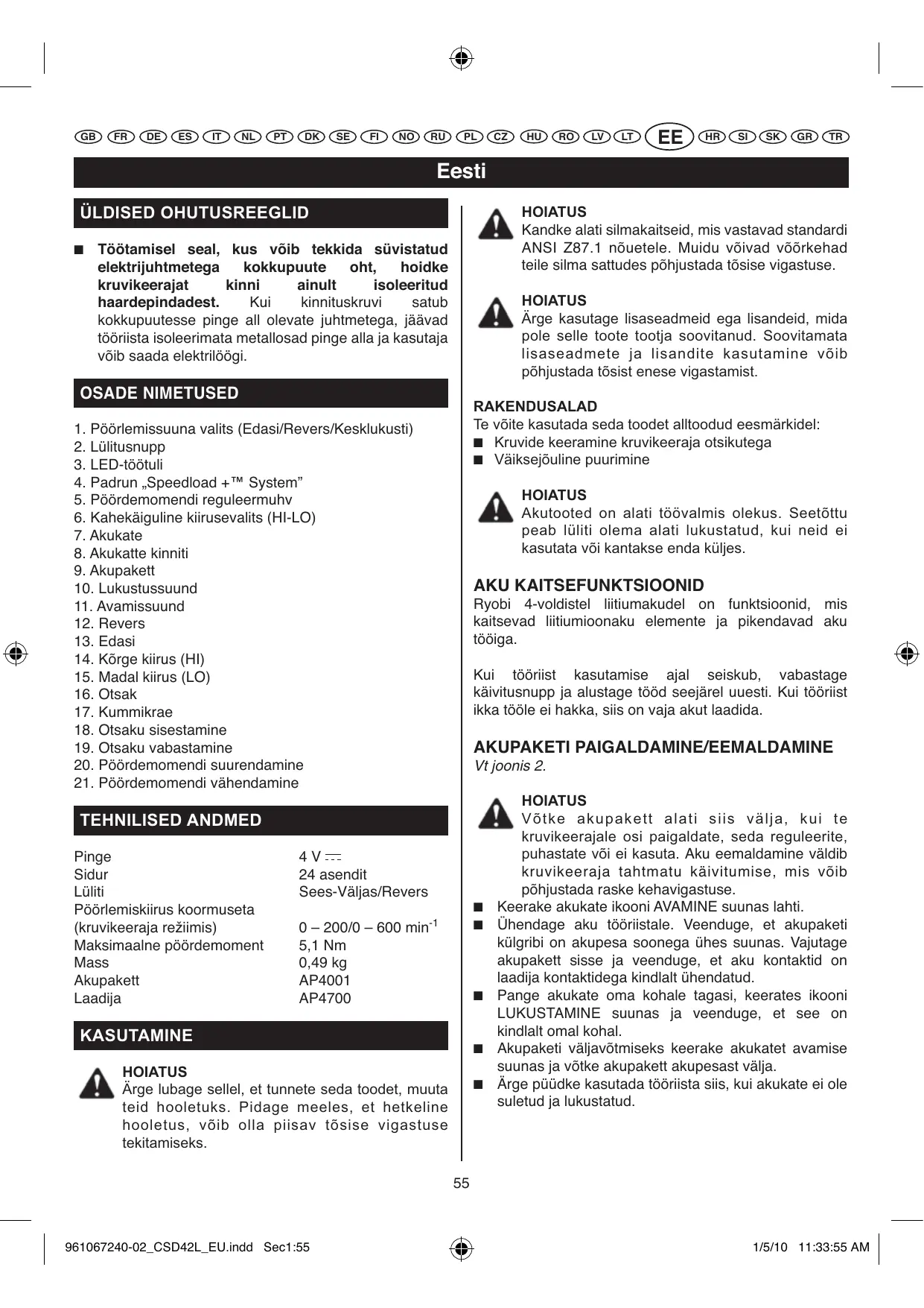 KASUTUSJUHEND CSD 40 LI, CSD42L RYOBI
