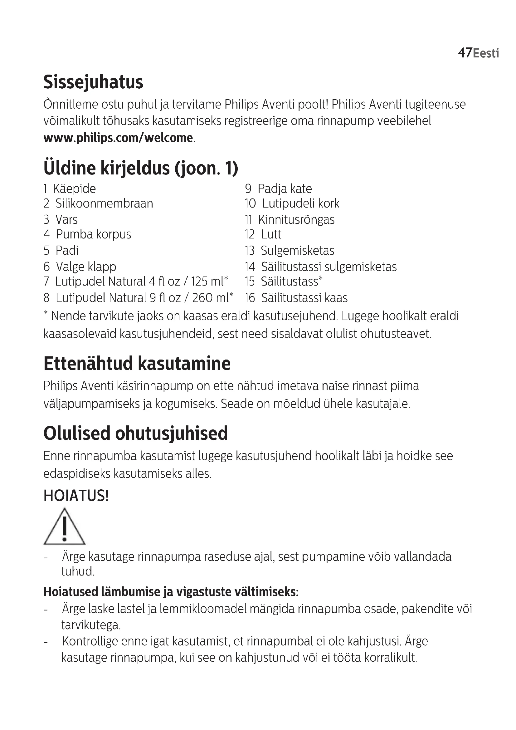 - Nende tarvikute jaoks on kaasas eraldi kasutusejuhend. Lugege hoolikalt eraldi kaasasolevaid kasutusjuhendeid, sest need sisaldavat olulist ohutusteavet. Ettenähtud kasutamine Philips Aventi käsirinnapump on ette nähtud imetava naise rinnast piima väljapumpamiseks ja kogumiseks. Seade on mõeldud ühele kasutajale. Olulised ohutusjuhised Enne rinnapumba kasutamist lugege kasutusjuhend hoolikalt läbi ja hoidke see edaspidiseks kasutamiseks alles. HOIATUS! - Ärge kasutage rinnapumpa raseduse ajal, sest pumpamine võib vallandada tuhud. Hoiatused lämbumise ja vigastuste vältimiseks: - Ärge laske lastel ja lemmikloomadel mängida rinnapumba osade, pakendite või tarvikutega. - Kontrollige enne igat kasutamist, et rinnapumbal ei ole kahjustusi. Ärge kasutage rinnapumpa, kui see on kahjustunud või ei tööta korralikult. 47EestiHoiatused saastumise vältimiseks ning hügieeni tagamiseks - Hügieeni kaalutlustel on rinnapump mõeldud korduvaks kasutamiseks ainult ühele kasutajale. - Puhastage ja desintseerige kõik osad enne esimest ja pärast iga järgnevat kasutamist. - Ärge kasutage rinnapumba osade puhastamisel antibakteriaalseid ega abrasiivseid puhastusvahendeid, sest need võivad osasid kahjustada. - Saastumise vältimiseks peske enne rinnapumba osade ja rindade puudutamist käed korralikult vee ja seebiga puhtaks. Vältige anumate või kaante puudutamist seestpoolt. Hoiatused rinna- ja nibuprobleemide, sh valu, vältimiseks - Enne pumba eemaldamist rinnalt tuleb vaakumi vabastamiseks käepide vabastada. - Kui vaakum on ebamugav või teeb haiget, lõpetage pumpamine ja eemaldage rinnapump rinnalt. - Kui teil ei õnnestu piima välja pumbata, ärge proovige korraga kauem kui viis minutit. Proovige päeva jooksul uuesti. - Kui protsess muutub väga ebamugavaks või valuliseks, lõpetage pumba kasutamine ja pidage nõu tervishoiutöötajaga. - Kasutage ainult Philips Aventi tarvikuid ja osasid. - Rinnapumba muutmine ei ole lubatud. Hoiatus. Kui olete ema, kes on nakatunud inimese immuunpuudulikkuse (HIV), B-hepatiidi või C-hepatiidi viirusesse, siis võtke teadmiseks, et rinnapumba kasutamine ei vähenda ega muuda olematuks rinnapiima kaudu beebile viiruse edasikandumise riski. Ettevaatust - Hoidke rinnapumba osad eemal kuumadest pindadest, et vältida nende deformeerumist. 48 EestiKasutamiseks valmistumine Enne rinnapumba esmakordset kasutamist ja pärast iga järgnevat kasutamist võtke rinnapump osadeks lahti ning puhastage ja desintseerige kõik rinnapumba osad. Ettevaatust! Valge klapi eemaldamisel ja puhastamisel olge ettevaatlik. Ärge pistke valge klapi sisse esemeid, sest see võib klappi kahjustada. Puhastamine ja desintseerimine Samm 1: Osadeks lahtivõtmine Võtke rinnapump ja lutipudel täielikult lahti. Eemaldage rinnapumbast ka valge klapp. Samm 2: Puhastamine Osasid saab pesta käsitsi või nõudepesumasinas. Hoiatus! Ärge kasutage rinnapumba osade puhastamisel antibakteriaalseid ega abrasiivseid puhastusvahendeid, sest need võivad osasid kahjustada. Samm 2A: Käsitsi puhastamine 1 Loputage kõiki osasid leige jooksva kraaniveega. 2 Hoidke kõiki osasid 5 minutit soojas vees, millele on lisatud väike kogus õrna nõudepesuvedelikku. 3 Puhastage kõiki osasid puhastusharjaga. 4 Loputage kõik osad põhjalikult külma puhta jooksva kraaniveega. 5 Pange kõik osad puhtale köögirätikule või kuivatusrestile ning laske neil õhu käes ära kuivada. Samm 2B: Nõudepesumasinas puhastamine Märkus. Toiduvärvid võivad osade värvi muuta. 1 Pange kõik osad nõudepesumasina ülemisele riiulile. 2 Pange nõudepesuvedelik või -tablett masinasse ja käivitage tavaprogramm. 3 Pange kõik osad puhtale köögirätikule või kuivatusrestile ning laske neil õhu käes ära kuivada. 49EestiSamm 3: Desintseerimine Ettevaatust! Keeva veega desintseerimise ajal ärge laske lutipudelil või muudel osadel puudutada poti seinu. See võib tekitada toote püsiva deformeerumise või kahjustuse, mille eest Philips ei vastuta. 1 Täitke keedupott piisava koguse veega, mis kataks kõik osad, ja pange kõik osad potti. Laske veel keeda 5 minutit. Veenduge, et osad ei puudutaks poti seina. 2 Laske veel jahtuda. 3 Võtke osad ettevaatlikult veest välja. Pange osad puhtale pinnale, köögirätikule või kuivatusrestile ning laske neil õhu käes ära kuivada. Rinnapumba kokkupanemine Veenduge, et rinnapumba osad, mis piimaga kokku puutuvad, oleksid puhastatud ja desintseeritud. Hoiatus! Kui olete rinnapumba osad desintseerinud neid vees keetes, olge ettevaatlik, sest osad võivad olla väga kuumad. Põletuste vältimiseks alustage rinnapumba kokkupanemist alles siis, kui desintseeritud osad on jahtunud. Kontrollige enne kasutamist rinnapumba komplekti kuuluvaid osasid kulumise või kahjustuste suhtes ja vajaduse korral asendage need. Märkus. Padja ja silikoonmembraani õige kohalepanemine on oluline, et rinnapump tekitaks korralikult vaakumi. 1 Pange valge klapp altpoolt pumba korpusesse. Lükake klapp nii sügavale kui võimalik (joon. 2). 2 Keerake pumba korpust päripäeva, kuni see on lutipudeli (joon. 3) või säilitustassi (joon. 4) külge kindlalt kinnitatud. Märkus. Säilitustassi kasutamisel peate kõigepealt selle külge keerama sulgemisketta (joon. 4). 3 Pange vars silikoonmembraani sisse (joon. 5). 4 Pange silikoonmembraan ülalt pumba korpusesse. Veenduge, et see paikneb kindlalt ümber ääriku, vajutades silikoonmembraanile sõrmedega ideaalse tiheduse tagamiseks (joon. 6). 50 Eesti5 Kinnitage varrega silikoonketta külge käepide, kinnitades käepidemes oleva ava üle varre otsa. Lükake käepidet allapoole pumba korpuse külge, kuni see klõpsatades oma kohale läheb (joon. 7). 6 Pange padi pumba korpusesse (joon. 8) ja veenduge, et padja äär katab pumba korpuse. Suruge padja siseosa lehtris vastu noolega näidatud joont (joon. 9). Märkus. Väljapumpamiseks ettevalmistumisel pange padjale kate rinnapumba puhtana hoidmiseks. Rinnapumba kasutamine Hoiatus! Kasutag