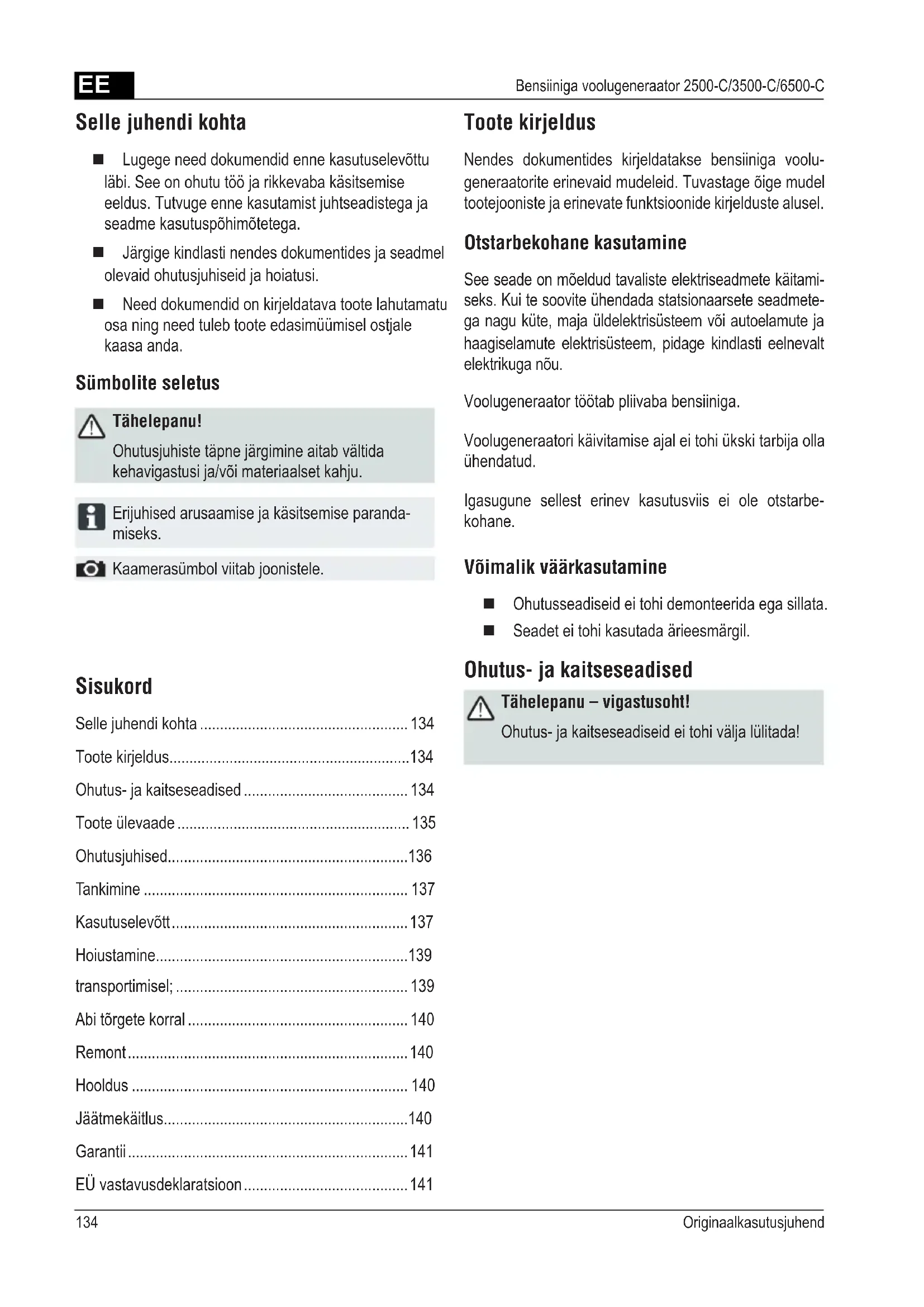 - Bensiiniga voolugeneraator 2500-C/3500-C/6500-C Sisukord Selle juhendi kohta p. 134