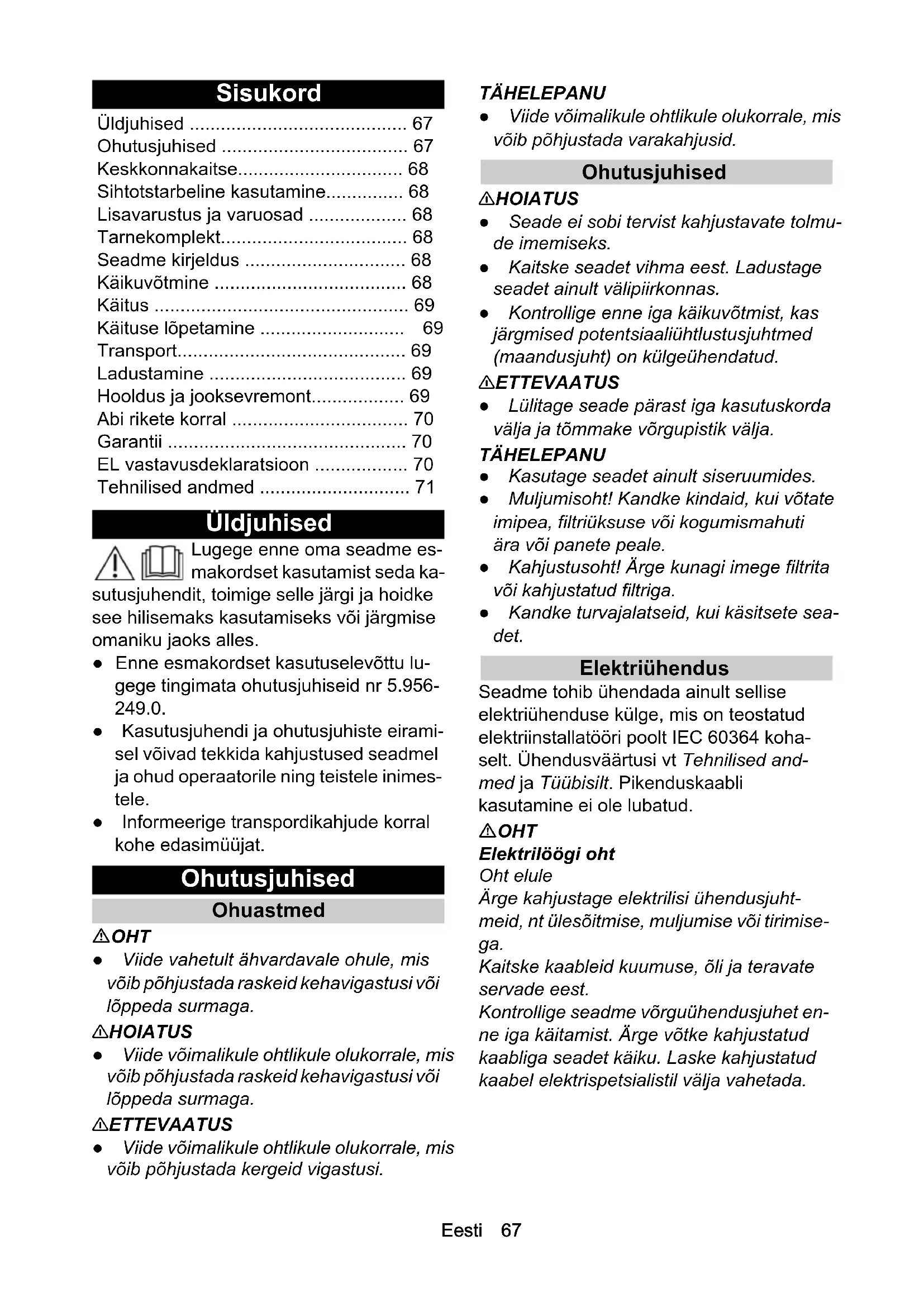 - ● Kasutusjuhendi ja ohutusjuhiste eirami- sel võivad tekkida kahjustused seadmel ja ohud operaatorile ning teistele inimes- tele. ● Informeerige transpordikahjude korral kohe edasimüüjat. Ohutusjuhised Ohuastmed OHT ● Viide vahetult ähvardavale ohule, mis võib põhjustada raskeid kehavigastusi või lõppeda surmaga. 몇 HOIATUS ● Viide võimalikule ohtlikule olukorrale, mis võib põhjustada raskeid kehavigastusi või lõppeda surmaga. 몇 ETTEVAATUS ● Viide võimalikule ohtlikule olukorrale, mis võib põhjustada kergeid vigastusi. TÄHELEPANU ● Viide võimalikule ohtlikule olukorrale, mis võib põhjustada varakahjusid. Ohutusjuhised 몇 HOIATUS ● Seade ei sobi tervist kahjustavate tolmu- de imemiseks. ● Kaitske seadet vihma eest. Ladustage seadet ainult välipiirkonnas. ● Kontrollige enne iga käikuvõtmist, kas järgmised potentsiaaliühtlustusjuhtmed (maandusjuht) on külgeühendatud. 몇 ETTEVAATUS ● Lülitage seade pärast iga kasutuskorda välja ja tõmmake võrgupistik välja. TÄHELEPANU ● Kasutage seadet ainult siseruumides. ● Muljumisoht! Kandke kindaid, kui võtate imipea, filtriüksuse või kogumismahuti ära või panete peale. ● Kahjustusoht! Ärge kunagi imege filtrita või kahjustatud filtriga. ● Kandke turvajalatseid, kui käsitsete sea- det. Elektriühendus Seadme tohib ühendada ainult sellise elektriühenduse külge, mis on teostatud elektriinstallatööri poolt IEC 60364 koha- selt. Ühendusväärtusi vt Tehnilised and- med ja Tüübisilt. Pikenduskaabli kasutamine ei ole lubatud. OHT Elektrilöögi oht Oht elule Ärge kahjustage elektrilisi ühendusjuht- meid, nt ülesõitmise, muljumise või tirimise- ga. Kaitske kaableid kuumuse, õli ja teravate servade eest. Kontrollige seadme võrguühendusjuhet en- ne iga käitamist. Ärge võtke kahjustatud kaabliga seadet käiku. Laske kahjustatud kaabel elektrispetsialistil välja vahetada. Üldjuhised p. 67