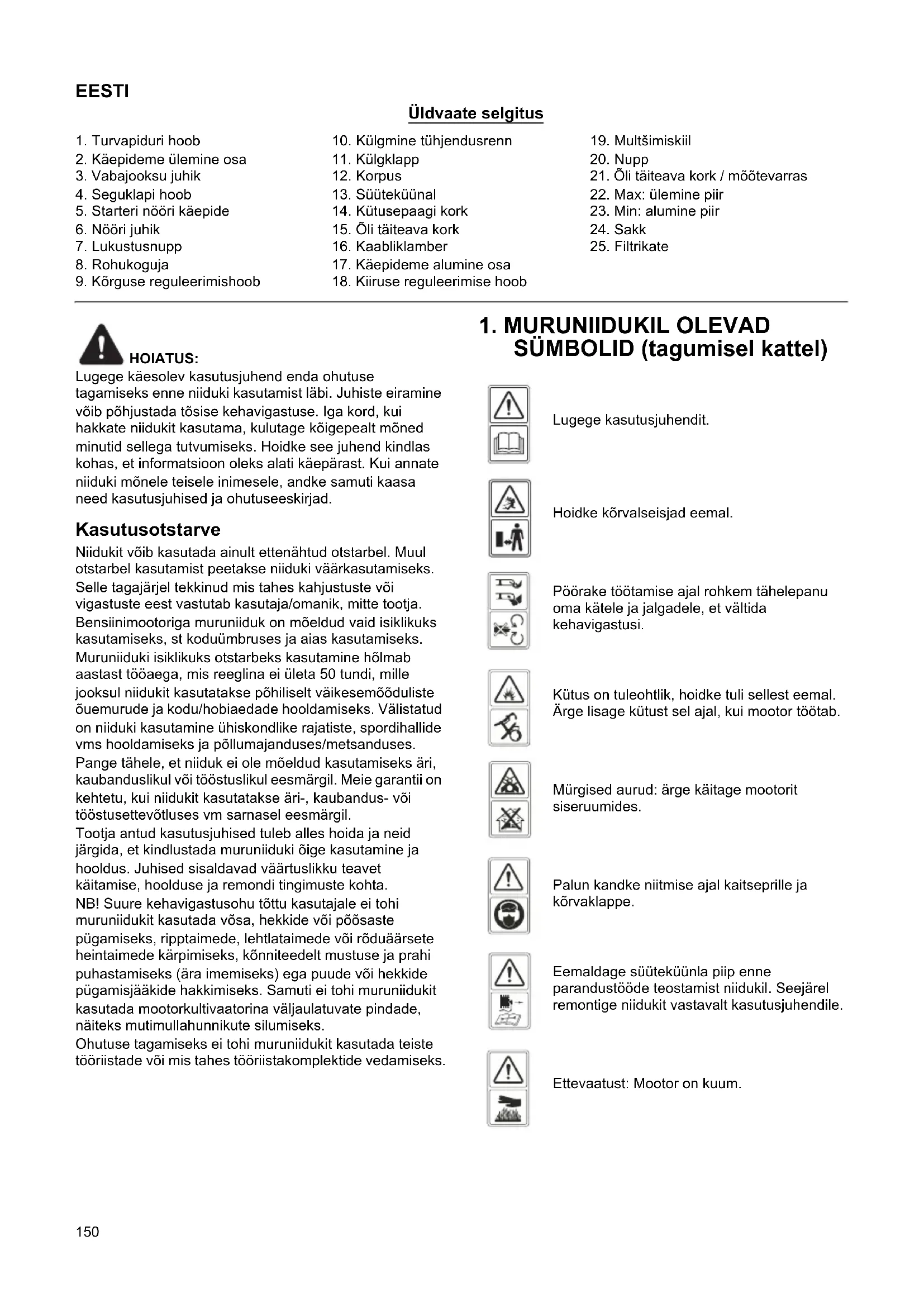 Lugege kasutusjuhendit. Hoidke kõrvalseisjad eemal. Pöörake töötamise ajal rohkem tähelepanu oma kätele ja jalgadele, et vältida kehavigastusi. Kütus on tuleohtlik, hoidke tuli sellest eemal. Ärge lisage kütust sel ajal, kui mootor töötab. Mürgised aurud: ärge käitage mootorit siseruumides. Palun kandke niitmise ajal kaitseprille ja kõrvaklappe. Eemaldage süüteküünla piip enne parandustööde teostamist niidukil. Seejärel remontige niidukit vastavalt kasutusjuhendile. Ettevaatust: Mootor on kuum.151