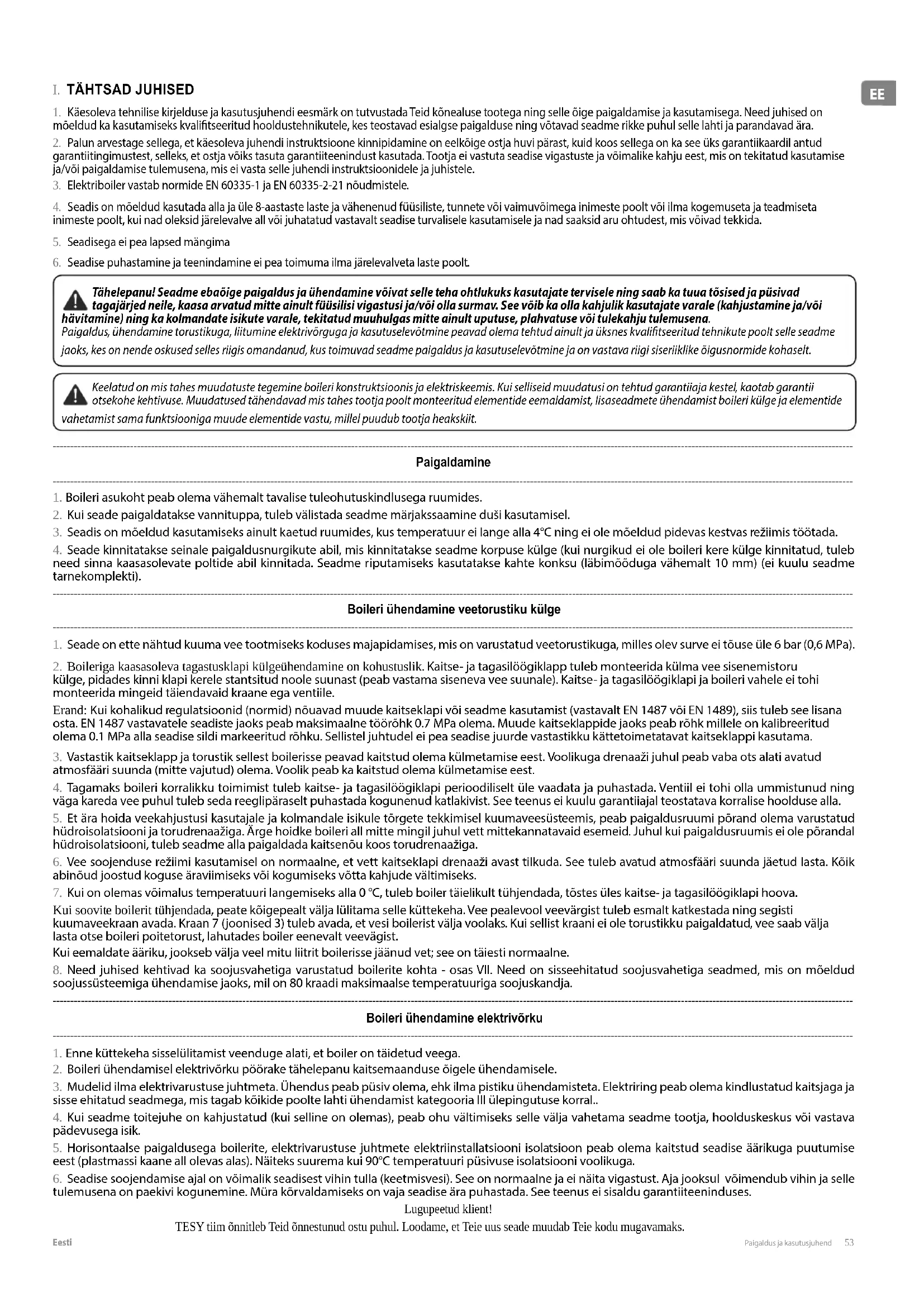 3. Mudelid ilma elektrivarustuse juhtmeta. Ühendus peab püsiv olema, ehk ilma pistiku ühendamisteta. Elektriring peab olema kindlustatud kaitsjaga ja sisse ehitatud seadmega, mis tagab kõikide poolte lahti ühendamist kategooria III ülepingutuse korral.. 4. Kui seadme toitejuhe on kahjustatud (kui selline on olemas), peab ohu vältimiseks selle välja vahetama seadme tootja, hoolduskeskus või vastava pädevusega isik. 5. Horisontaalse paigaldusega boilerite, elektrivarustuse juhtmete elektriinstallatsiooni isolatsioon peab olema kaitstud seadise äärikuga puutumise eest (plastmassi kaane all olevas alas). Näiteks suurema kui 90°C temperatuuri püsivuse isolatsiooni voolikuga. 6. Seadise soojendamise ajal on võimalik seadisest vihin tulla (keetmisvesi). See on normaalne ja ei näita vigastust. Aja jooksul võimendub vihin ja selle tulemusena on paekivi kogunemine. Müra kõrvaldamiseks on vaja seadise ära puhastada. See teenus ei sisaldu garantiiteeninduses. Lugupeetud klient! TESY tiim õnnitleb Teid õnnestunud ostu puhul. Loodame, et Teie uus seade muudab Teie kodu mugavamaks.54 Paigaldus ja kasutusjuhend