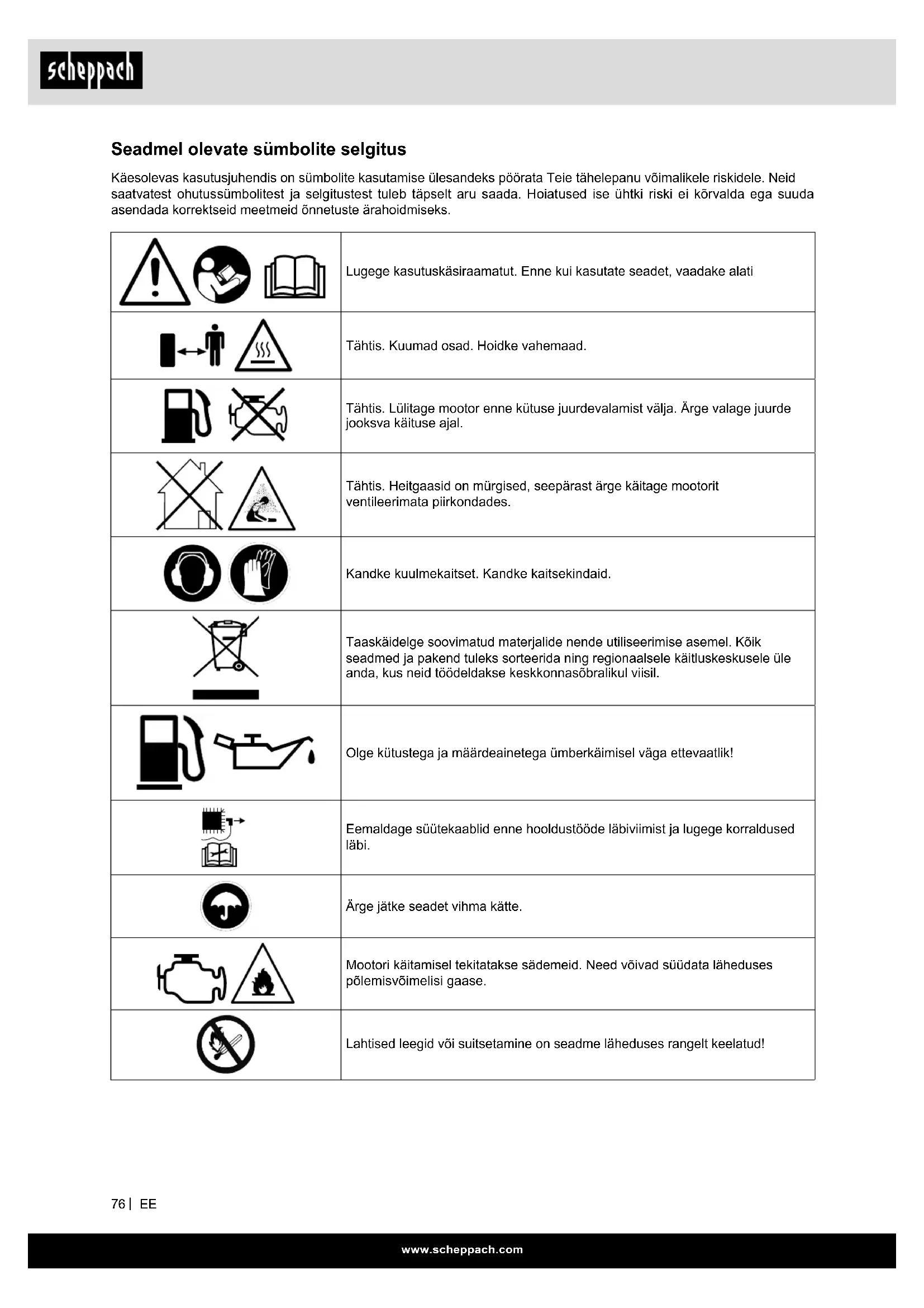 Seadmel olevate sümbolite selgitus Käesolevas kasutusjuhendis on sümbolite kasutamise ülesandeks pöörata Teie tähelepanu võimalikele riskidele. Neid saatvatest ohutussümbolitest ja selgitustest tuleb täpselt aru saada. Hoiatused ise ühtki riski ei kõrvalda ega suuda asendada korrektseid meetmeid õnnetuste ärahoidmiseks. Lugege kasutuskäsiraamatut. Enne kui kasutate seadet, vaadake alati Tähtis. Kuumad osad. Hoidke vahemaad. Tähtis. Lülitage mootor enne kütuse juurdevalamist välja. Ärge valage juurde jooksva käituse ajal. Tähtis. Heitgaasid on mürgised, seepärast ärge käitage mootorit ventileerimata piirkondades. Kandke kuulmekaitset. Kandke kaitsekindaid. Taaskäidelge soovimatud materjalide nende utiliseerimise asemel. Kõik seadmed ja pakend tuleks sorteerida ning regionaalsele käitluskeskusele üle anda, kus neid töödeldakse keskkonnasõbralikul viisil. Olge kütustega ja määrdeainetega ümberkäimisel väga ettevaatlik! Eemaldage süütekaablid enne hooldustööde läbiviimist ja lugege korraldused läbi. Ärge jätke seadet vihma kätte. Mootori käitamisel tekitatakse sädemeid. Need võivad süüdata läheduses põlemisvõimelisi gaase. Lahtised leegid või suitsetamine on seadme läheduses rangelt keelatud!www.scheppach.com
