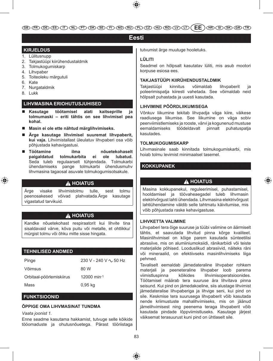 Kasutage töötamisel alati kaitseprille ja tolmumaski – eriti tähtis on see lihvimisel pea kohal. Masin ei ole ette nähtud märglihvimiseks. Ärge kasutage lihvimisel suuremat lihvpaberit, kui vaja. Lihvimistallast üleulatuv lihvpaberi osa võib põhjustada kehavigastusi.