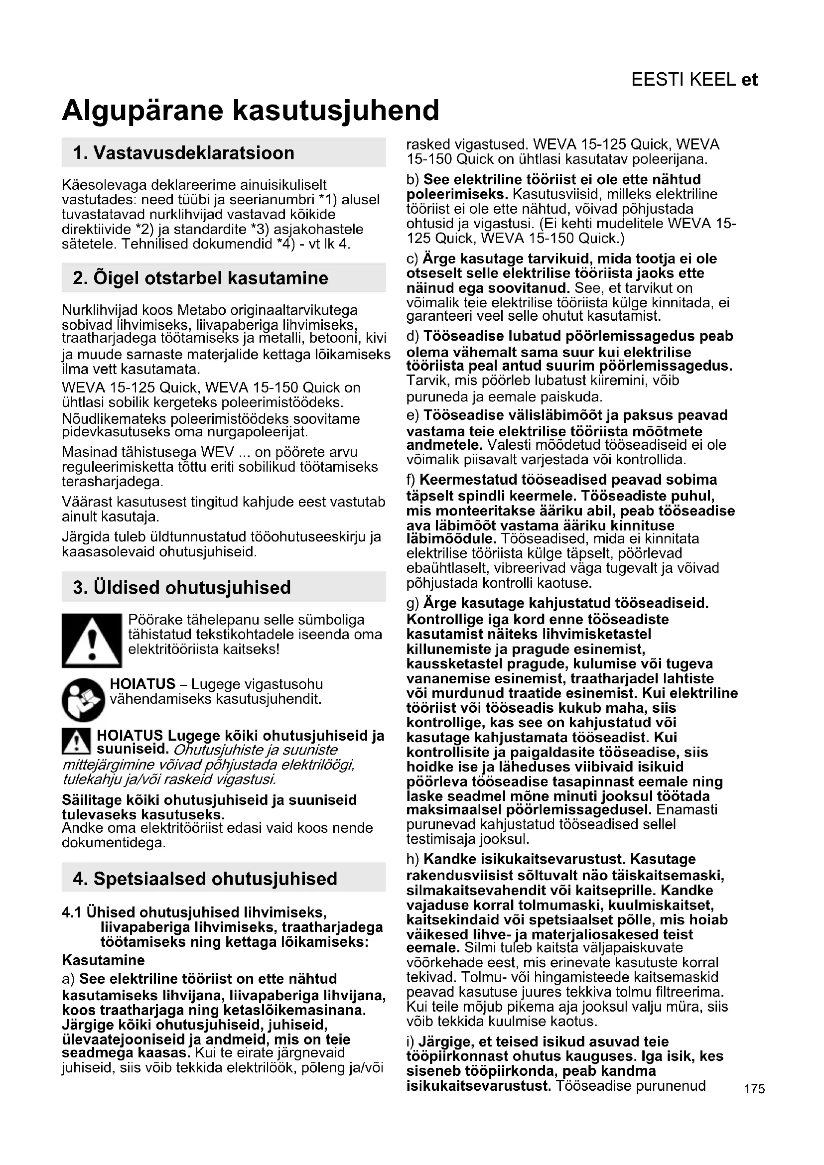 Algupärane kasutusjuhend Käesolevaga deklareerime ainuisikuliselt vastutades: need tüübi ja seerianumbri *1) alusel tuvastatavad nurklihvijad vastavad kõikide direktiivide *2) ja standardite *3) asjakohastele sätetele. Tehnilised dokumendid *4) - vt lk 4. Nurklihvijad koos Metabo originaaltarvikutega sobivad lihvimiseks, liivapaberiga lihvimiseks, traatharjadega töötamiseks ja metalli, betooni, kivi ja muude sarnaste materjalide kettaga lõikamiseks ilma vett kasutamata. WEVA 15-125 Quick, WEVA 15-150 Quick on ühtlasi sobilik kergeteks poleerimistöödeks. Nõudlikemateks poleerimistöödeks soovitame pidevkasutuseks oma nurgapoleerijat. Masinad tähistusega WEV ... on pöörete arvu reguleerimisketta tõttu eriti sobilikud töötamiseks terasharjadega. Väärast kasutusest tingitud kahjude eest vastutab ainult kasutaja. Järgida tuleb üldtunnustatud tööohutuseeskirju ja kaasasolevaid ohutusjuhiseid. Pöörake tähelepanu selle sümboliga tähistatud tekstikohtadele iseenda oma elektritööriista kaitseks! HOIATUS – Lugege vigastusohu vähendamiseks kasutusjuhendit. HOIATUS Lugege kõiki ohutusjuhiseid ja suuniseid. Ohutusjuhiste ja suuniste mittejärgimine võivad põhjustada elektrilöögi, tulekahju ja/või raskeid vigastusi. Säilitage kõiki ohutusjuhiseid ja suuniseid tulevaseks kasutuseks. Andke oma elektritööriist edasi vaid koos nende dokumentidega.