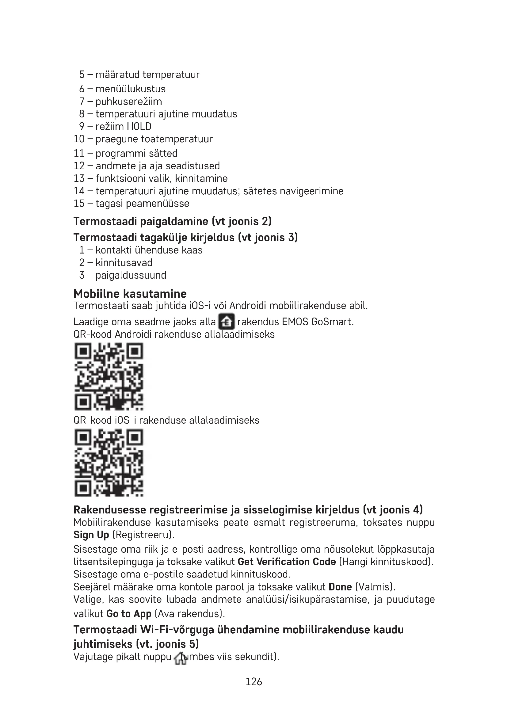 lisamine avaekraanile ja muud sarnased sätted Termostaadi kustutamine rakendusest (vt joonis 10) Vajutage pikalt termostaadi ikooni, eemaldage termostaadi eest märge ja toksake termostaadi kustutamiseks prügikasti ikooni. Kasutaja ülevaade/Parooli muutmine/Rakenduse värskendamine Toksake paremas alanurgas olevat ikooni ja seejärel paremas ülanurgas olevat ikooni. See avab uue sätetega menüü. PAIGALDAMINE Tähelepanu! Enne termostaadi vahetamist eemaldage küttesüsteem oma kodu vooluvõrgust. See hoiab ära võimaliku vigastuse elektrivooluga. Termostaadi paigaldamine